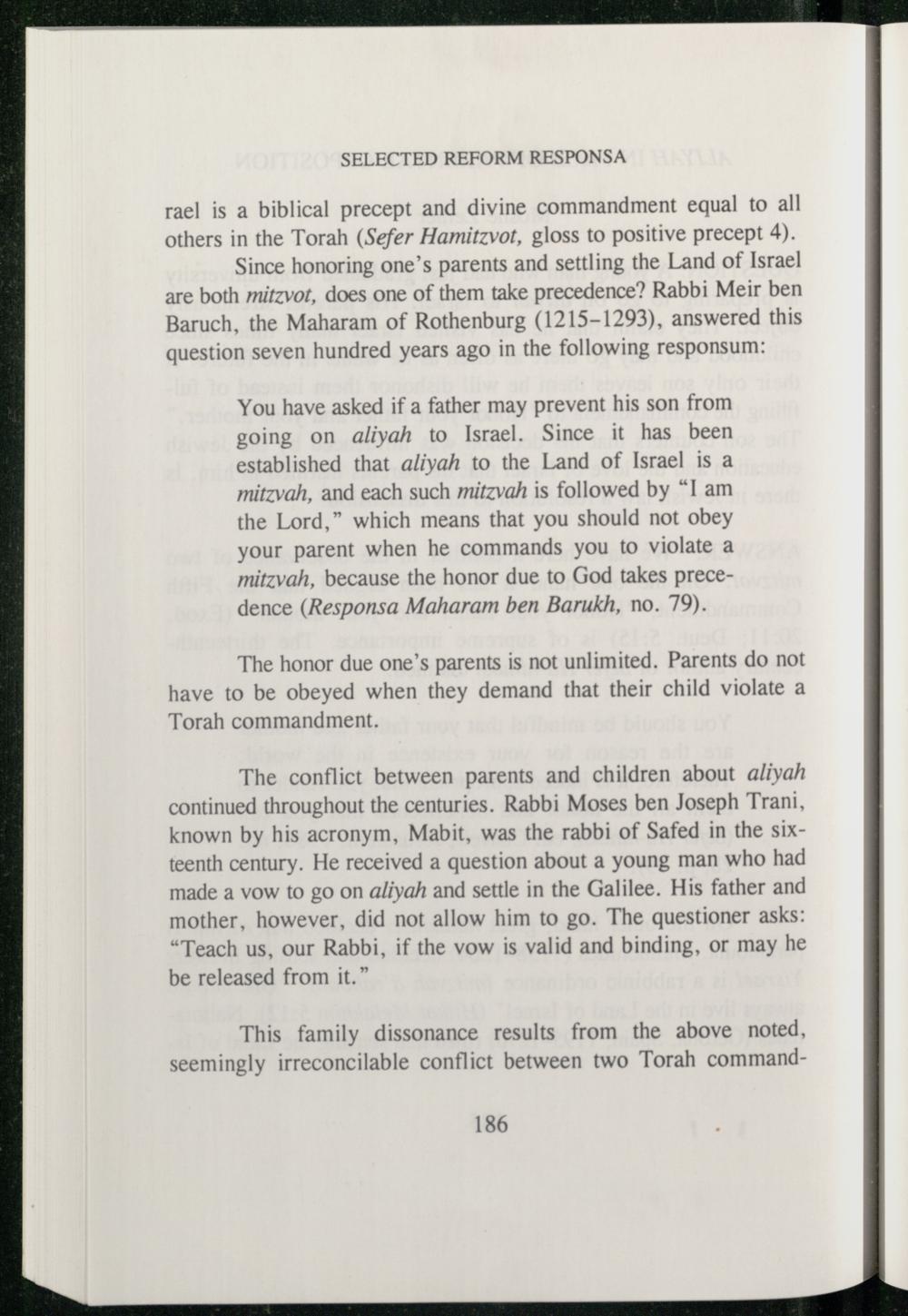 rael is a biblical precept and divine commandment equal to all others in the Torah (Sefer Hamitzvot, gloss to positive precept 4). Since honoring one’s parents and settling the Land of Israel are both mitzvot, does one of them take precedence? Rabbi Meir ben Baruch , the Maharam of Rothenburg (1215-1293), answered this question seven hundred years ago in the following responsum: