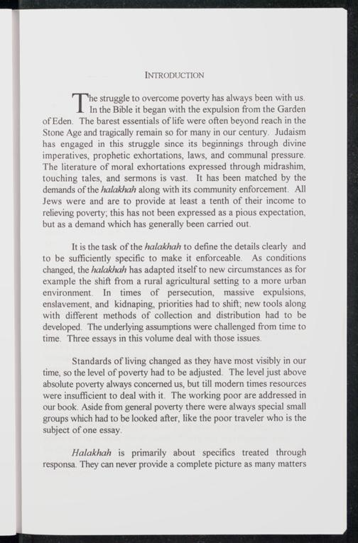 It is the task of the halakhah to define the details clearly and to be sufficiently specific to make it enforceable. As conditions changed, the halakhah has adapted itself to new circumstances as for example the shift from a rural agricultural setting to a more urban environment. In times of persecution, massive expulsions, enslavement, and kidnaping, priorities had to shift; new tools along with different methods of collection and distribution had to be developed. The underlying assumptions were challenged from time to time. Three essays in this volume deal with those issues.