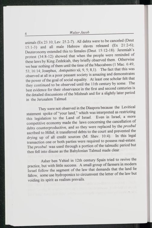 4 Walter Jacob animals(Ex 23.10; Lev. 25.2-7). All debts were to be canceled(Deut 15:1-3) and all male Hebrew slaves released(Ex 21:2-6); Deuteronomy extended this to females(Deut. 15:12-18). Jeremiah’s protest(34:8-12) showed that when the people were reminded of these laws by King Zedekiah , they briefly observed them. Otherwise we hear nothing of them until the time of the Maccabees (1 Mac. 6:49, 53: 16:14; Josephus , Antiquities xii, 9, 5; 8,1). The fact that this was observed at all in a poor peasant society is amazing and demonstrates the power of the goal of social equality. At least one scholar felt that they continued to be observed until the 11th century by some. The best evidence for their observance in the first and second centuries is the detailed discussions of the Mishnah and for a slightly later period in the Jerusalem Talmud.