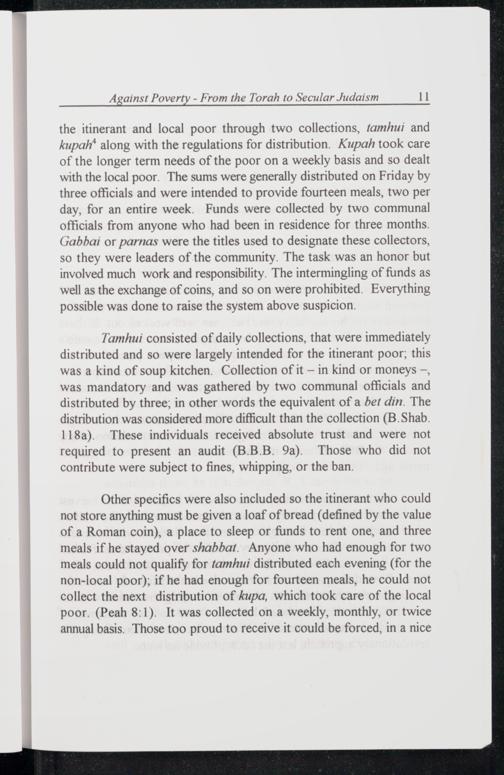 the itinerant and local poor through two collections, tamhui and kupah* along with the regulations for distribution. Kupah took care of the longer term needs of the poor on a weekly basis and so dealt with the local poor. The sums were generally distributed on Friday by three officials and were intended to provide fourteen meals, two per day, for an entire week. Funds were collected by two communal officials from anyone who had been in residence for three months. Gabbai or parnas were the titles used to designate these collectors, so they were leaders of the community. The task was an honor but involved much work and responsibility. The intermingling of funds as well as the exchange of coins, and so on were prohibited. Everything possible was done to raise the system above suspicion.