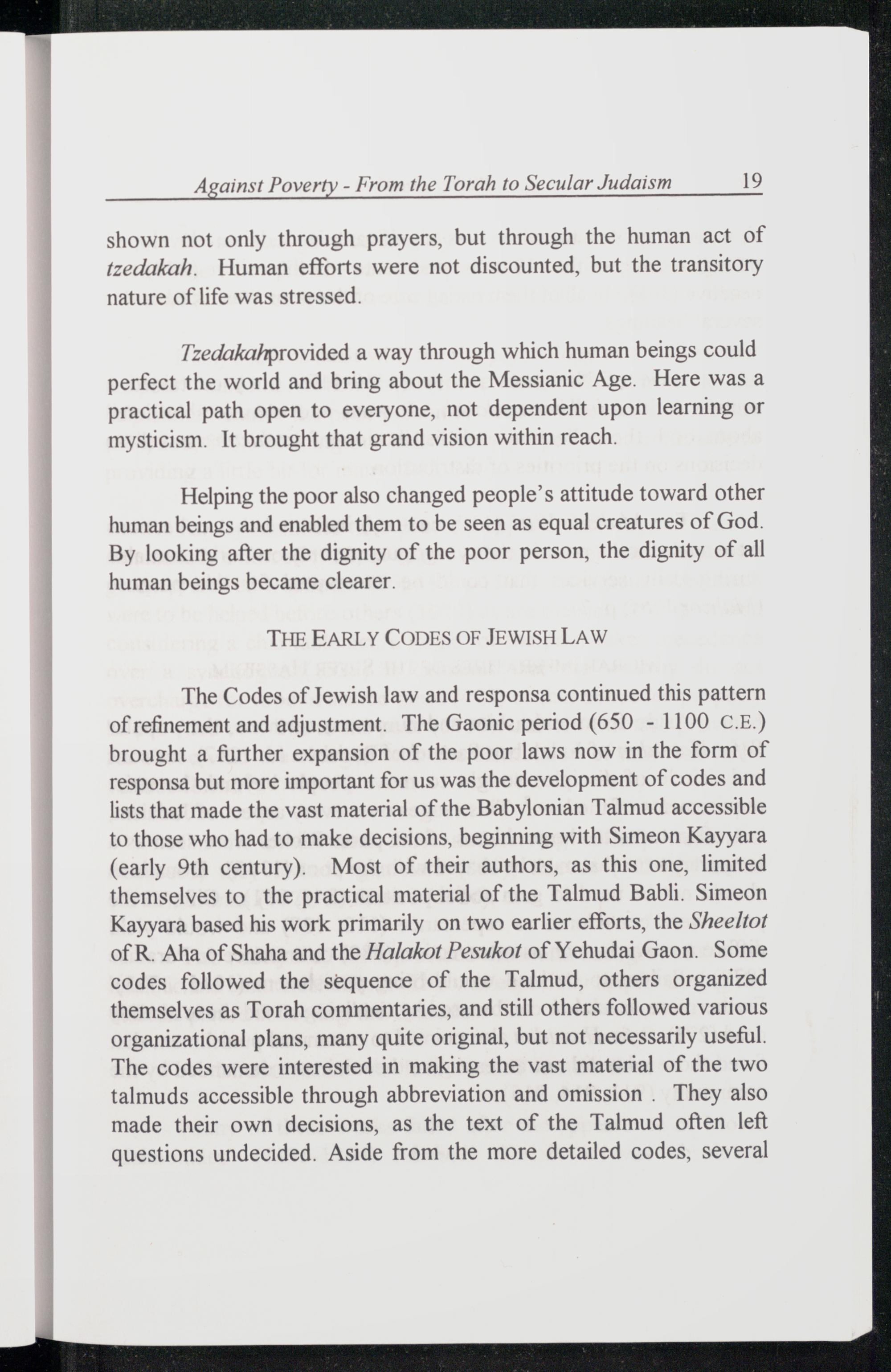 The Codes of Jewish law and responsa continued this pattern of refinement and adjustment. The Gaonic period(650- 1100 CE.) brought a further expansion of the poor laws now in the form of responsa but more important for us was the development of codes and lists that made the vast material of the Babylonian Talmud accessible to those who had to make decisions, beginning with Simeon Kayyara (early 9th century). Most of their authors, as this one, limited themselves to the practical material of the Talmud Babli. Simeon Kayyara based his work primarily on two earlier efforts, the Sheeltot of R. Aha of Shaha and the Halakot Pesukot of Yehudai Gaon . Some codes followed the sequence of the Talmud , others organized themselves as Torah commentaries, and still others followed various organizational plans, many quite original, but not necessarily useful. The codes were interested in making the vast material of the two talmuds accessible through abbreviation and omission. They also made their own decisions, as the text of the Talmud often left questions undecided. Aside from the more detailed codes, several