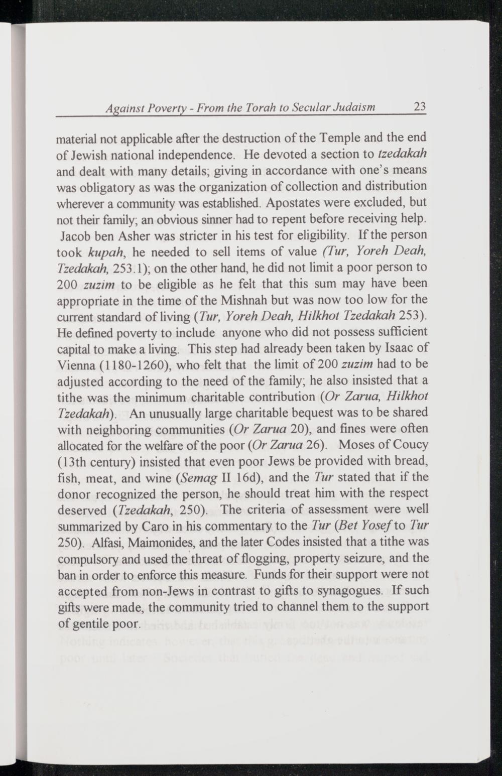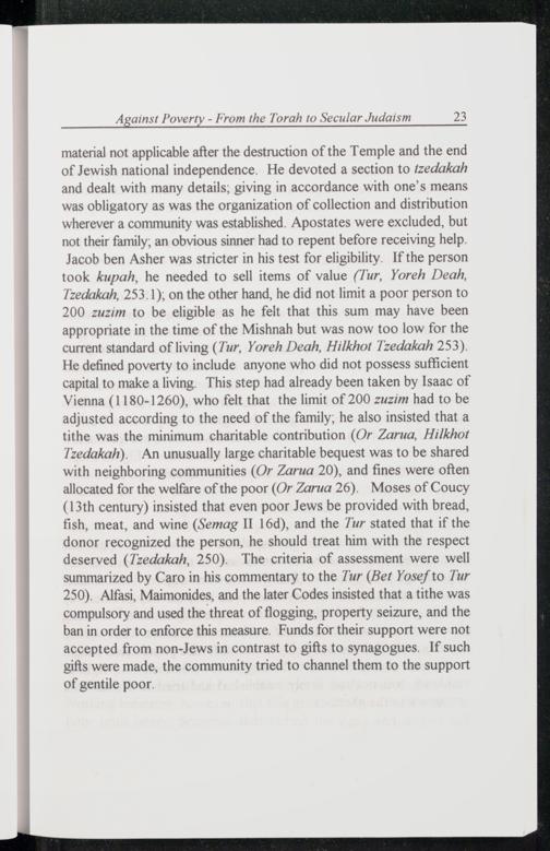 material not applicable after the destruction of the Temple and the end of Jewish national independence. He devoted a section to tzedakah and dealt with many details; giving in accordance with one’s means was obligatory as was the organization of collection and distribution wherever a community was established. Apostates were excluded, but not their family; an obvious sinner had to repent before receiving help. Jacob ben Asher was stricter in his test for eligibility. If the person took kupah, he needed to sell items of value(7ur, Yoreh Deah, Tzedakah, 253.1); on the other hand, he did not limit a poor person to 200 zuzim to be eligible as he felt that this sum may have been appropriate in the time of the Mishnah but was now too low for the current standard of living(7ur, Yoreh Deah, Hilkhot Tzedakah 253). He defined poverty to include anyone who did not possess sufficient capital to make a living. This step had already been taken by Isaac of Vienna(1180-1260), who felt that the limit of 200 zuzim had to be adjusted according to the need of the family; he also insisted that a tithe was the minimum charitable contribution(Or Zarua, Hilkhot Tzedakah). An unusually large charitable bequest was to be shared with neighboring communities(Or Zarua 20), and fines were often allocated for the welfare of the poor(Or Zarua 26). Moses of Coucy (13th century) insisted that even poor Jews be provided with bread, fish, meat, and wine(Semag II 16d), and the 7ur stated that if the donor recognized the person, he should treat him with the respect deserved(7zedakah, 250). The criteria of assessment were well summarized by Caro in his commentary to the Tur(Bet Yosef to Tur 250). Alfasi, Maimonides , and the later Codes insisted that a tithe was compulsory and used the threat of flogging, property seizure, and the ban in order to enforce this measure. Funds for their support were not accepted from non-Jews in contrast to gifts to synagogues. If such gifts were made, the community tried to channel them to the support of gentile poor.