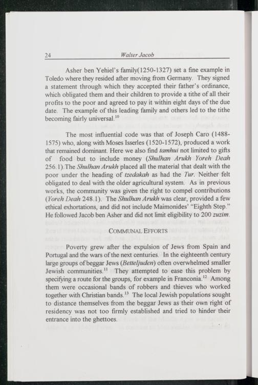 The most influential code was that of Joseph Caro (14881575) who, along with Moses Isserles (1520-1572), produced a work that remained dominant. Here we also find famhui not limited to gifts of food but to include money(Shulhan Arukh Yoreh Deah 256.1). The Shulhan Arukh placed all the material that dealt with the poor under the heading of tzedakah as had the Tur. Neither felt obligated to deal with the older agricultural system. As in previous works, the community was given the right to compel contributions (Yoreh Deah 248.1). The Shulhan Arukh was clear, provided a few ethical exhortations, and did not include Maimonides ’“Eighth Step.” He followed Jacob ben Asher and did not limit eligibility to 200 zuzim.