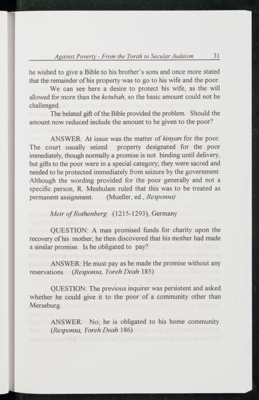 he wished to give a Bible to his brother’s sons and once more stated that the remainder of his property was to go to his wife and the poor. We can see here a desire to protect his wife, as the will allowed for more than the ketubah, so the basic amount could not be challenged. The belated gift of the Bible provided the problem. Should the amount now reduced include the amount to be given to the poor?