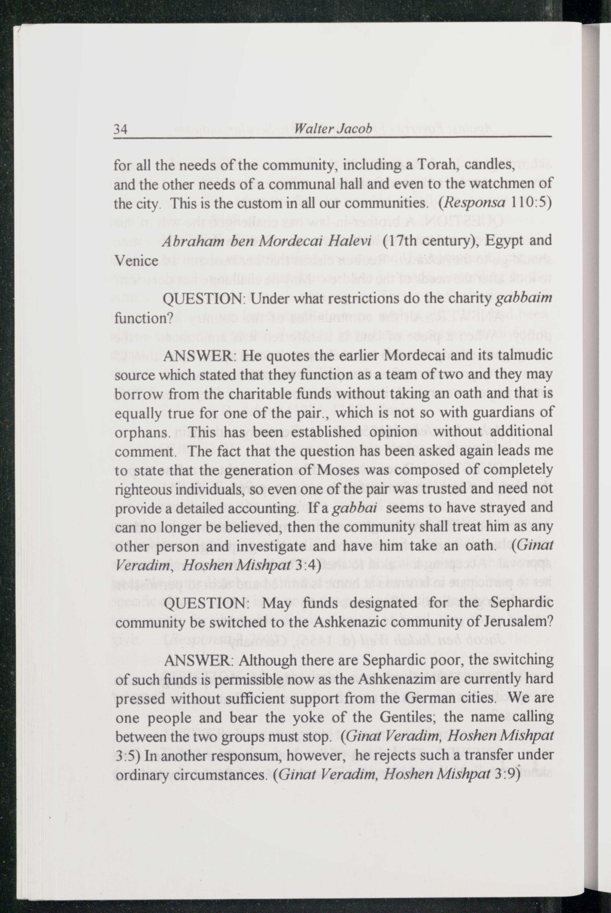 ANSWER: Although there are Sephardic poor, the switching of such funds is permissible now as the Ashkenazim are currently hard pressed without sufficient support from the German cities. We are one people and bear the yoke of the Gentiles; the name calling between the two groups must stop.(Ginat Veradim, Hoshen Mishpat 3:5) In another responsum, however, he rejects such a transfer under ordinary circumstances.(Ginat Veradim, Hoshen Mishpat 3:9)