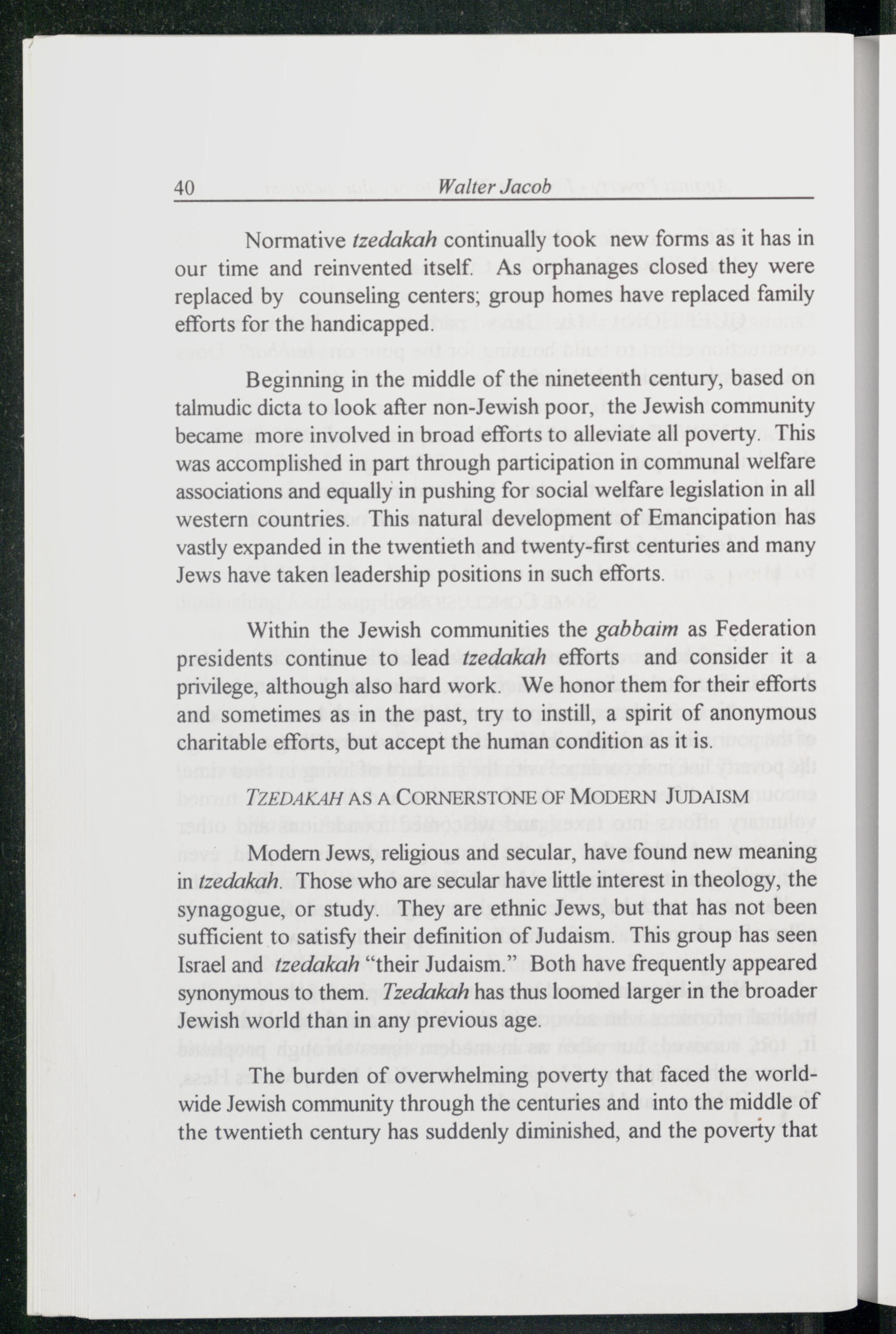 Modern Jews , religious and secular, have found new meaning in tzedakah. Those who are secular have little interest in theology, the synagogue, or study. They are ethnic Jews , but that has not been sufficient to satisfy their definition of Judaism . This group has seen Israel and tzedakah “their Judaism .” Both have frequently appeared synonymous to them. 7zedakah has thus loomed larger in the broader Jewish world than in any previous age.