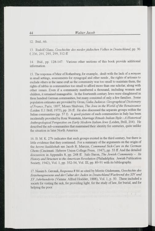 15. The responsa of Meir of Rothenburg , for example, dealt with the lack of a minyan in small settings, assessments for synagogal and other needs, the rights of artisans to exclude others in the same craft as the community was too small to maintain them, the rights of rabbis in communities too small to afford more than one scholar, along with other issues. Even if a community numbered a thousand, including women and children, it remained manageable. In the fourteenth century Jews were slaughtered in three hundred German communities, but many consisted of only a few families. Some population estimates are provided by Gross, Galia Judaica- Geographical Dictionary of France , Paris , 1897, Moses Shulvass, The Jews in the World of the Renaissance (Leiden : EJ. Brill , 1973), pp. 26 ff . He also discussed the separate groups within the Italian communities(pp. 57 f). A good picture of such communities in Italy has been incidentally provided by Roni Weinstein, Marriage Rituals Italian Style- A Historical Anthropological Perspective on Early Modern Italian Jews (Leiden , Brill , 204). He described the sub-communities that maintained their identity for centuries, quite unlike the situation in later North America .