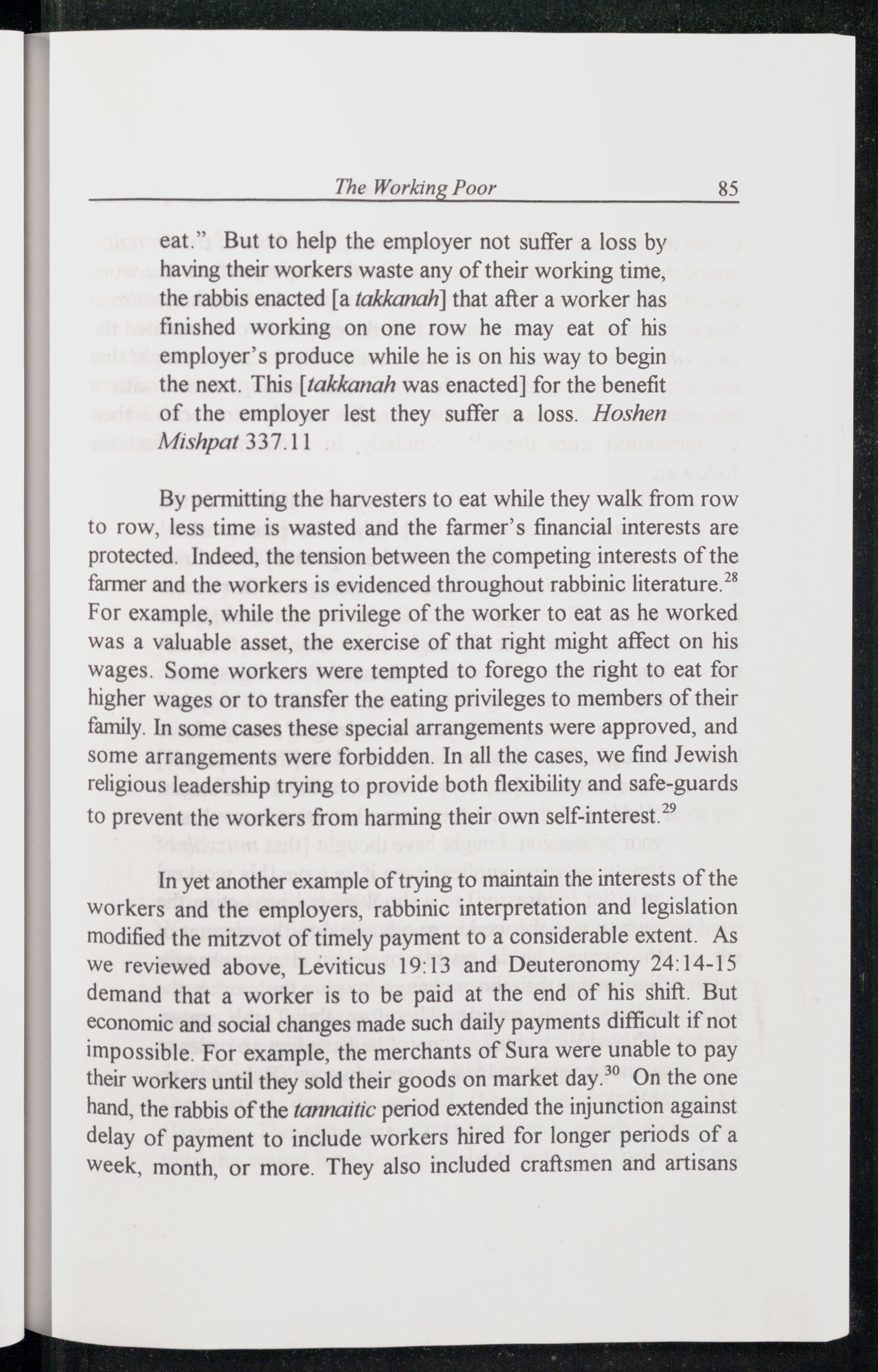 By permitting the harvesters to eat while they walk from row to row, less time is wasted and the farmer’s financial interests are protected. Indeed, the tension between the competing interests of the farmer and the workers is evidenced throughout rabbinic literature. For example, while the privilege of the worker to eat as he worked was a valuable asset, the exercise of that right might affect on his wages. Some workers were tempted to forego the right to eat for higher wages or to transfer the eating privileges to members of their family. In some cases these special arrangements were approved, and some arrangements were forbidden. In all the cases, we find Jewish religious leadership trying to provide both flexibility and safe-guards to prevent the workers from harming their own self-interest.”