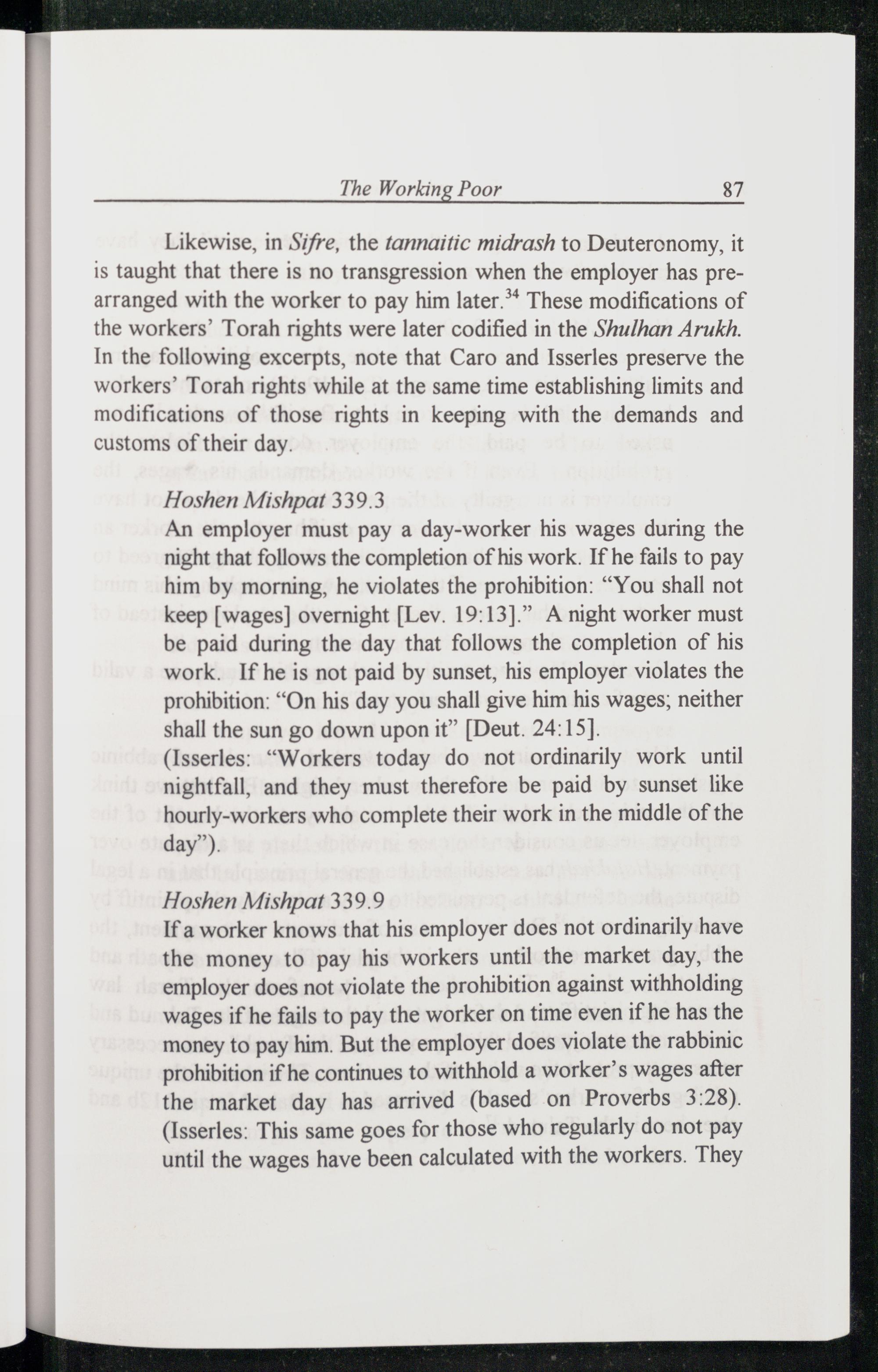 Likewise, in Sifre , the tannaitic midrash to Deuteronomy , it is taught that there is no transgression when the employer has prearranged with the worker to pay him later.** These modifications of the workers’ Torah rights were later codified in the Shulhan Arukh. In the following excerpts, note that Caro and Isserles preserve the workers’ Torah rights while at the same time establishing limits and modifications of those rights in keeping with the demands and customs of their day.