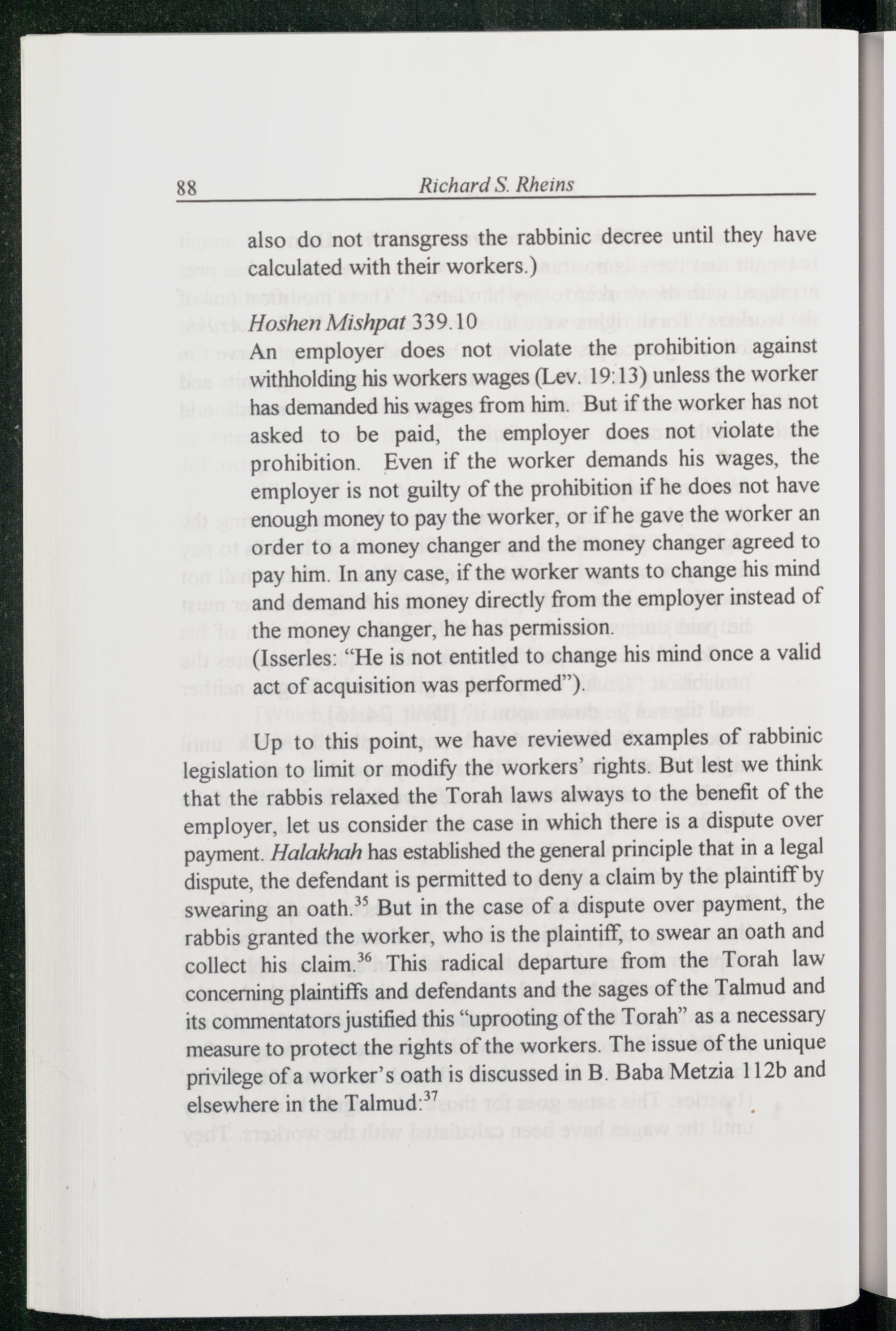Up to this point, we have reviewed examples of rabbinic legislation to limit or modify the workers’ rights. But lest we think that the rabbis relaxed the Torah laws always to the benefit of the employer, let us consider the case in which there is a dispute over payment. Halakhah has established the general principle that in a legal dispute, the defendant is permitted to deny a claim by the plaintiff by swearing an oath.** But in the case of a dispute over payment, the rabbis granted the worker, who is the plaintiff, to swear an oath and collect his claim.* This radical departure from the Torah law concerning plaintiffs and defendants and the sages of the Talmud and its commentators justified this“uprooting of the Torah ” as a necessary measure to protect the rights of the workers. The issue of the unique privilege of a worker’s oath is discussed in B. Baba Metzia 112b and elsewhere in the Talmud :*’