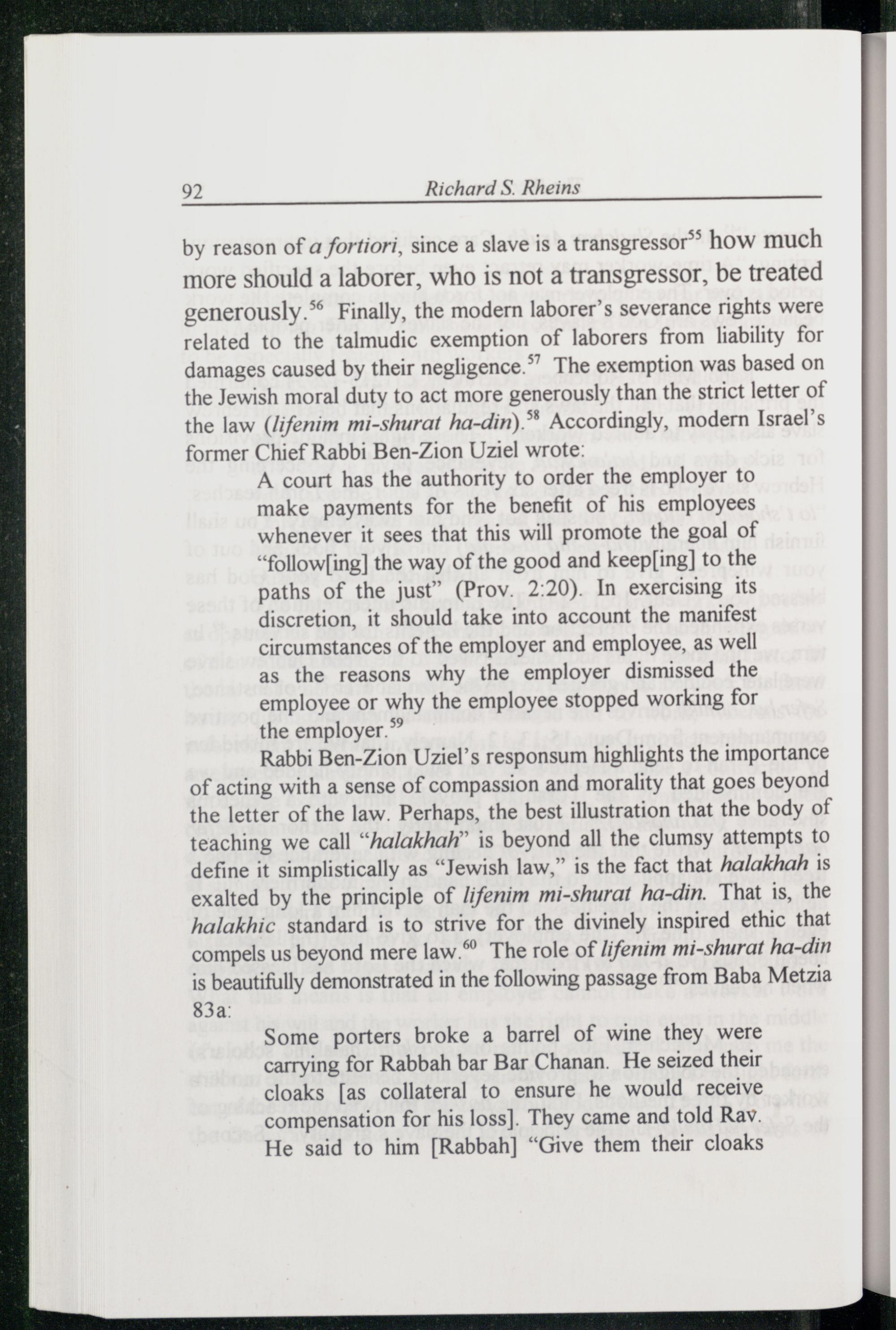 by reason of a fortiori, since a slave is a transgressor” how much more should a laborer, who is not a transgressor, be treated generously.® Finally, the modern laborer’s severance rights were related to the talmudic exemption of laborers from liability for damages caused by their negligence.’ The exemption was based on the Jewish moral duty to act more generously than the strict letter of the law(lifenim mi-shurat ha-din).** Accordingly, modern Israel ’s former Chief Rabbi Ben-Zion Uziel wrote:
