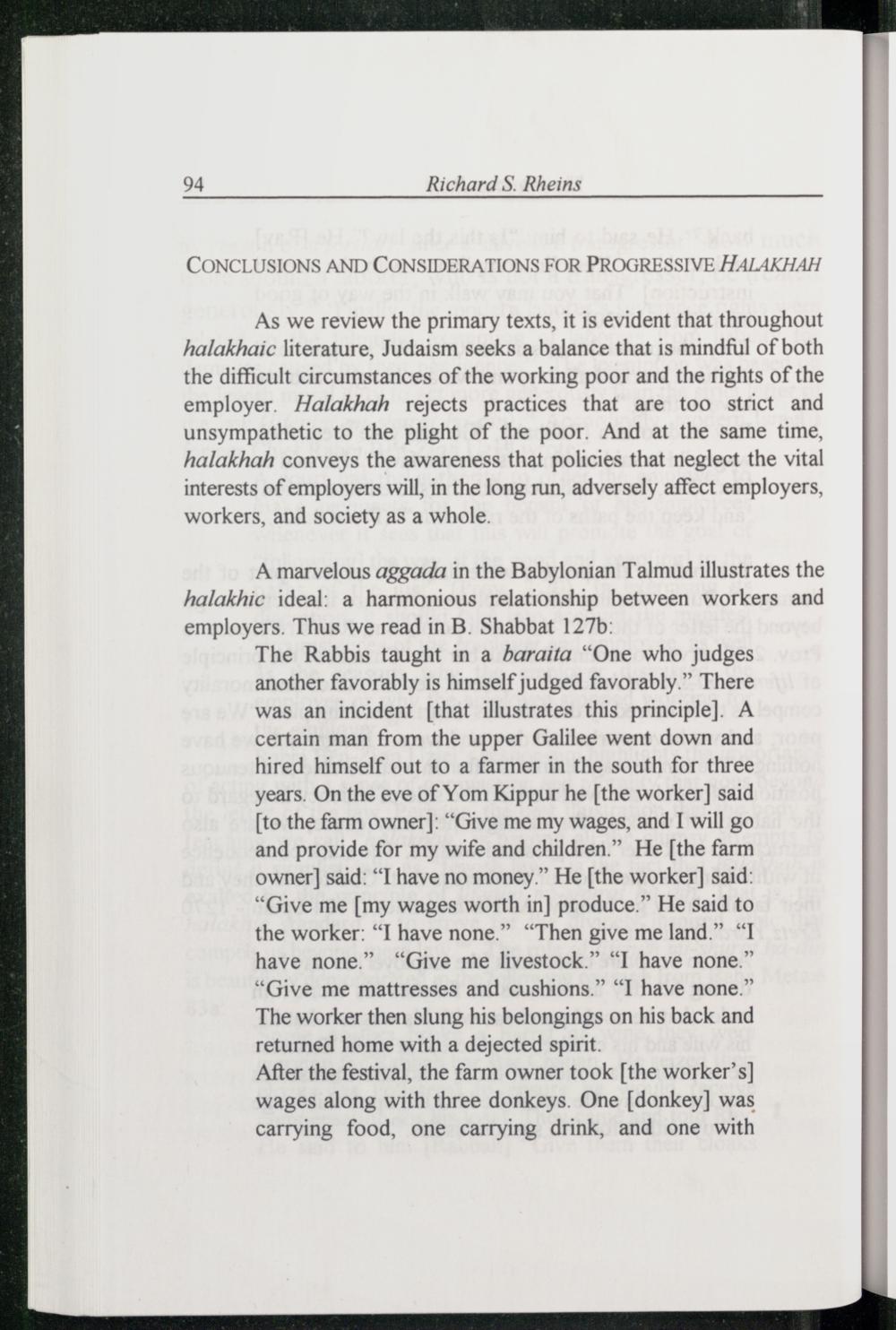 As we review the primary texts, it is evident that throughout halakhaic literature, Judaism seeks a balance that is mindful of both the difficult circumstances of the working poor and the rights of the employer. Halakhah rejects practices that are too strict and unsympathetic to the plight of the poor. And at the same time, halakhah conveys the awareness that policies that neglect the vital interests of employers will, in the long run, adversely affect employers, workers, and society as a whole.