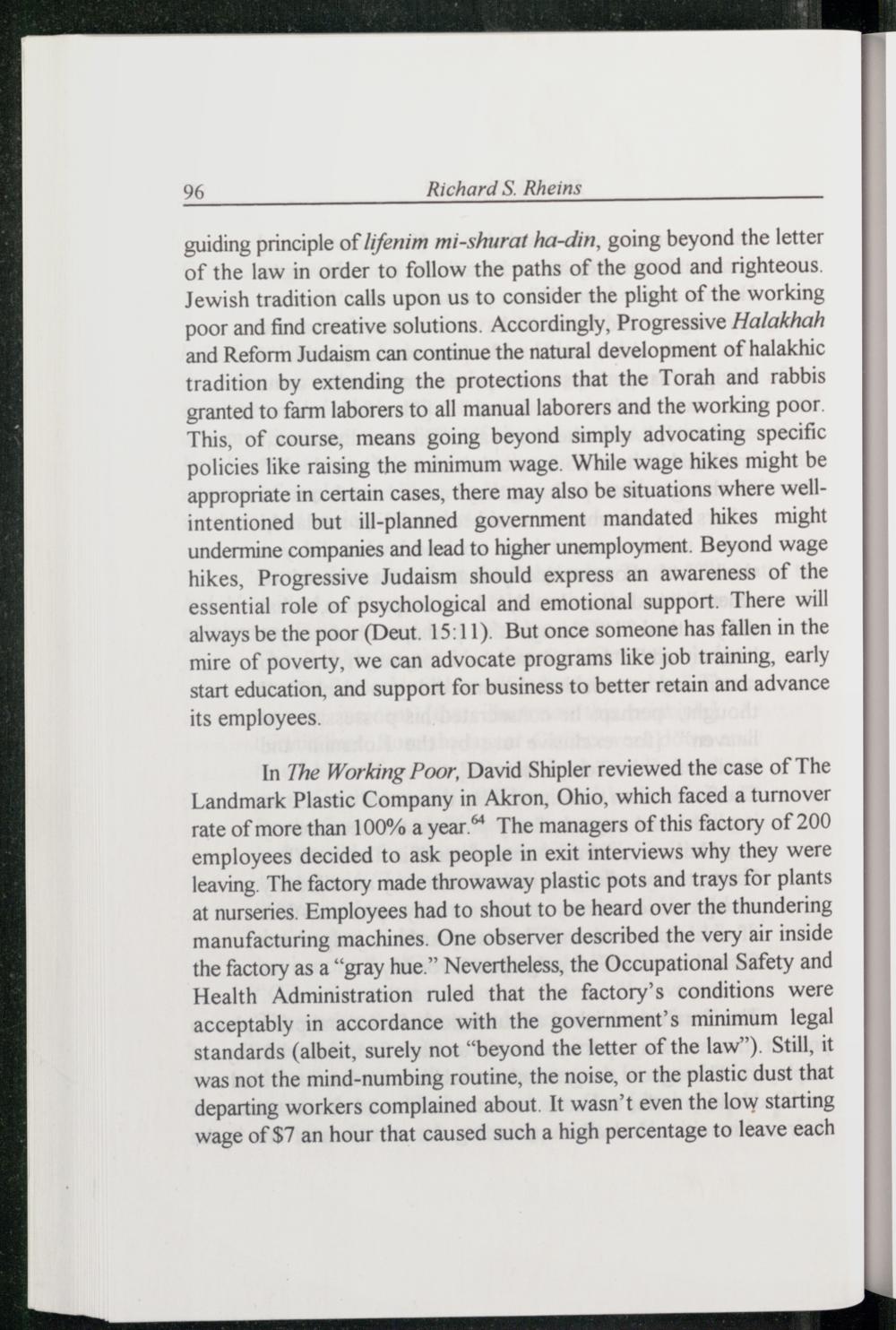 guiding principle of lifenim mi-shurat ha-din, going beyond the letter of the law in order to follow the paths of the good and righteous. Jewish tradition calls upon us to consider the plight of the working poor and find creative solutions. Accordingly, Progressive Halakhah and Reform Judaism can continue the natural development of halakhic tradition by extending the protections that the Torah and rabbis granted to farm laborers to all manual laborers and the working poor. This, of course, means going beyond simply advocating specific policies like raising the minimum wage. While wage hikes might be appropriate in certain cases, there may also be situations where wellintentioned but ill-planned government mandated hikes might undermine companies and lead to higher unemployment. Beyond wage hikes, Progressive Judaism should express an awareness of the essential role of psychological and emotional support. There will always be the poor(Deut. 15:11). But once someone has fallen in the mire of poverty, we can advocate programs like job training, early