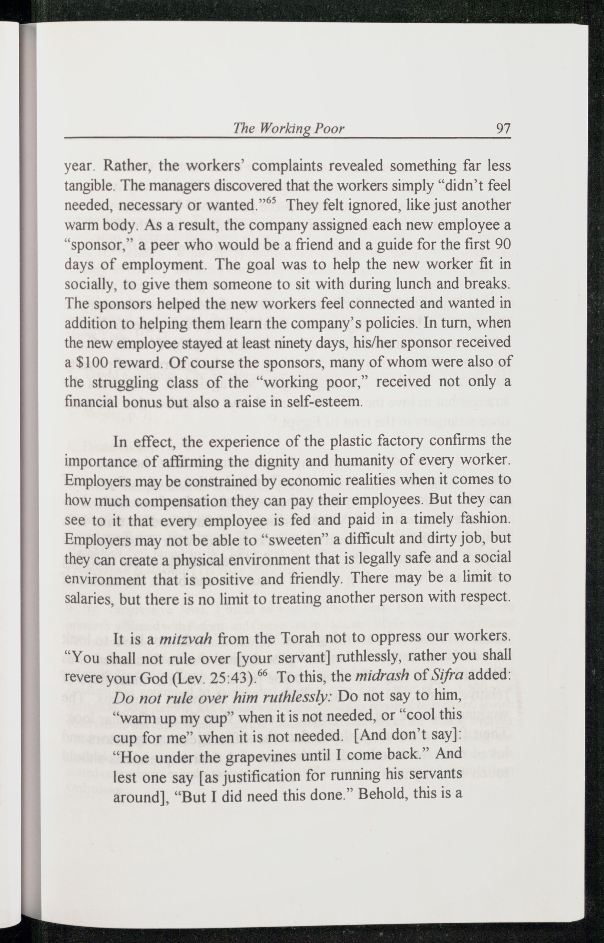 year. Rather, the workers’ complaints revealed something far less tangible. The managers discovered that the workers simply“didn’t feel needed, necessary or wanted.”®® They felt ignored, like just another warm body. As a result, the company assigned each new employee a “sponsor,” a peer who would be a friend and a guide for the first 90 days of employment. The goal was to help the new worker fit in socially, to give them someone to sit with during lunch and breaks. The sponsors helped the new workers feel connected and wanted in addition to helping them learn the company’s policies. In turn, when the new employee stayed at least ninety days, his/her sponsor received a$100 reward. Of course the sponsors, many of whom were also of the struggling class of the“working poor,” received not only a financial bonus but also a raise in self-esteem.
