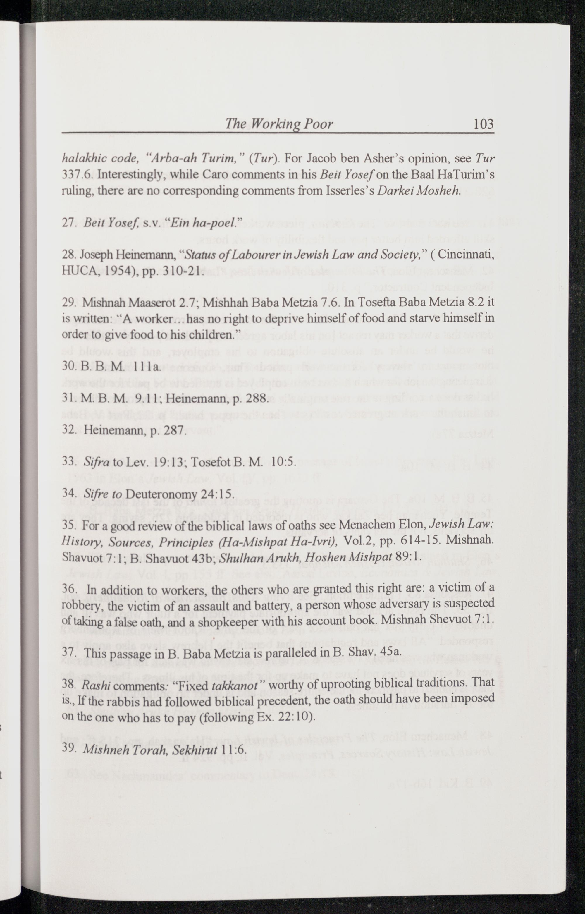 29. Mishnah Maaserot 2.7; Mishhah Baba Metzia 7.6. In Tosefta Baba Metzia 8.2 it is written:“A worker... has no right to deprive himself of food and starve himself in order to give food to his children.” 30.B.B.M. ll1a 31.M. B. M. 9.11; Heinemann, p. 288.