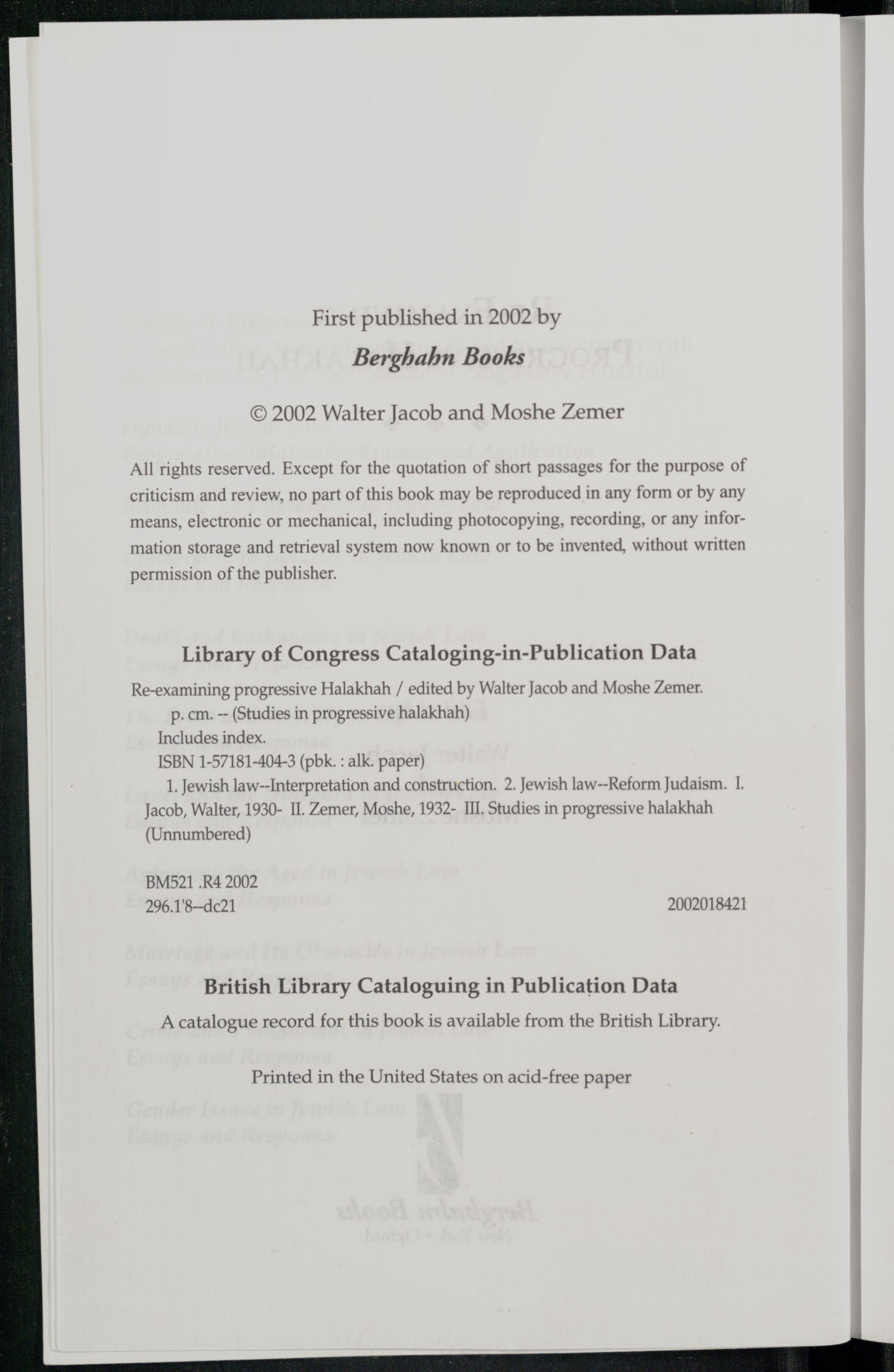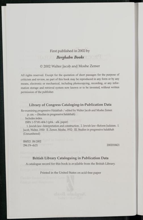 Library of Congress Cataloging-in-Publication Data Re-examining progressive Halakhah/ edited by Walter Jacob and Moshe Zemer . p. cm.--(Studies in progressive halakhah) Includes index. ISBN 1-57181-404-3(pbk.: alk. paper) 1. Jewish law--Interpretation and construction. 2. Jewish law--Reform Judaism. I. Jacob, Walter , 1930- II. Zemer , Moshe, 1932- III. Studies in progressive halakhah (Unnumbered)
