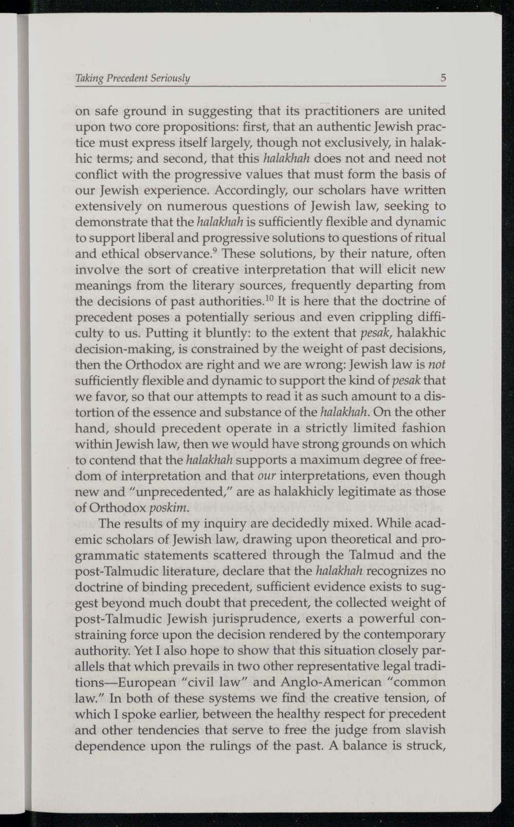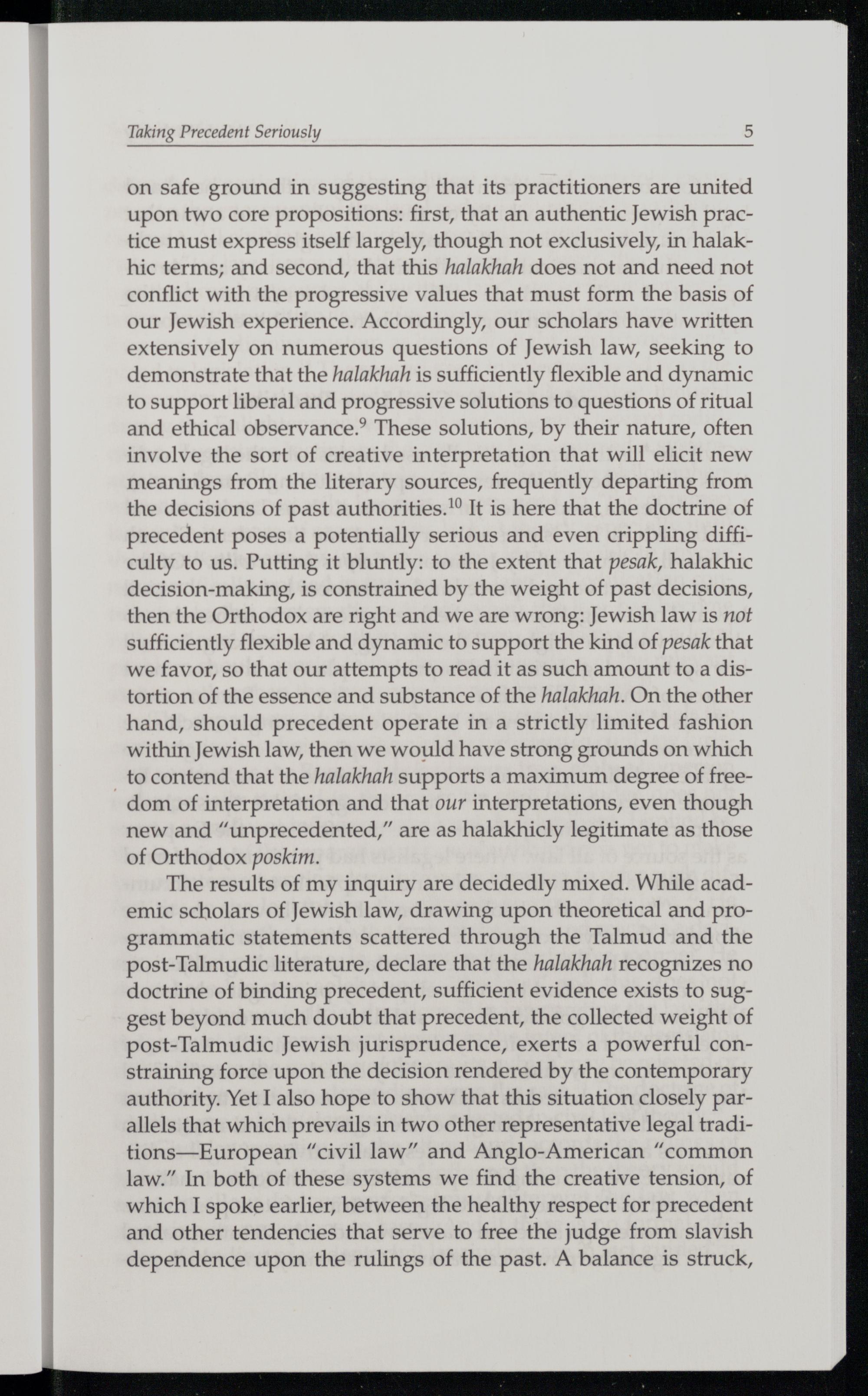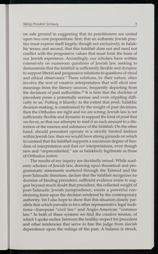 on safe ground in suggesting that its practitioners are united upon two core propositions: first, that an authentic Jewish practice must express itself largely, though not exclusively, in halakhic terms; and second, that this halakhah does not and need not conflict with the progressive values that must form the basis of our Jewish experience. Accordingly, our scholars have written extensively on numerous questions of Jewish law, seeking to demonstrate that the halakhah is sufficiently flexible and dynamic to support liberal and progressive solutions to questions of ritual and ethical observance.” These solutions, by their nature, often involve the sort of creative interpretation that will elicit new meanings from the literary sources, frequently departing from the decisions of past authorities.'” It is here that the doctrine of precedent poses a potentially serious and even crippling difficulty to us. Putting it bluntly: to the extent that pesak, halakhic decision-making, is constrained by the weight of past decisions, then the Orthodox are right and we are wrong: Jewish law is not sufficiently flexible and dynamic to support the kind of pesak that we favor, so that our attempts to read it as such amount to a distortion of the essence and substance of the halakhah. On the other hand, should precedent operate in a strictly limited fashion within Jewish law, then we would have strong grounds on which to contend that the halakhah supports a maximum degree of freedom of interpretation and that our interpretations, even though new and“unprecedented,” are as halakhicly legitimate as those of Orthodox poskim.