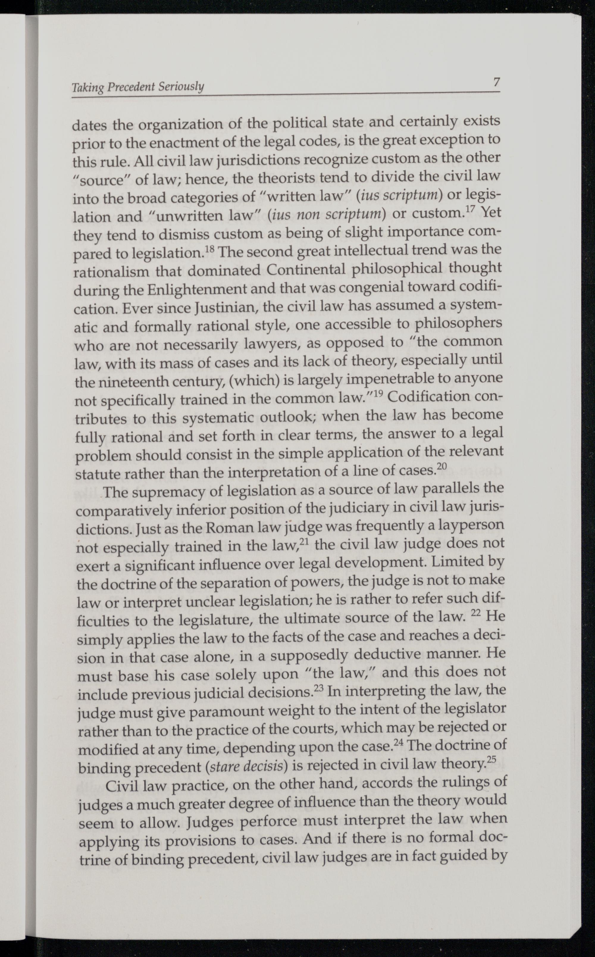 dates the organization of the political state and certainly exists prior to the enactment of the legal codes, is the great exception to this rule. All civil law jurisdictions recognize custom as the other “source” of law; hence, the theorists tend to divide the civil law into the broad categories of“written law”(ius scriptum) or legislation and“unwritten law”(ius non scriptum) or custom.” Yet they tend to dismiss custom as being of slight importance compared to legislation.'® The second great intellectual trend was the rationalism that dominated Continental philosophical thought during the Enlightenment and that was congenial toward codification. Ever since Justinian , the civil law has assumed a systematic and formally rational style, one accessible to philosophers who are not necessarily lawyers, as opposed to“the common law, with its mass of cases and its lack of theory, especially until the nineteenth century,(which) is largely impenetrable to anyone not specifically trained in the common law.” Codification contributes to this systematic outlook; when the law has become fully rational and set forth in clear terms, the answer to a legal problem should consist in the simple application of the relevant statute rather than the interpretation of a line of cases.’