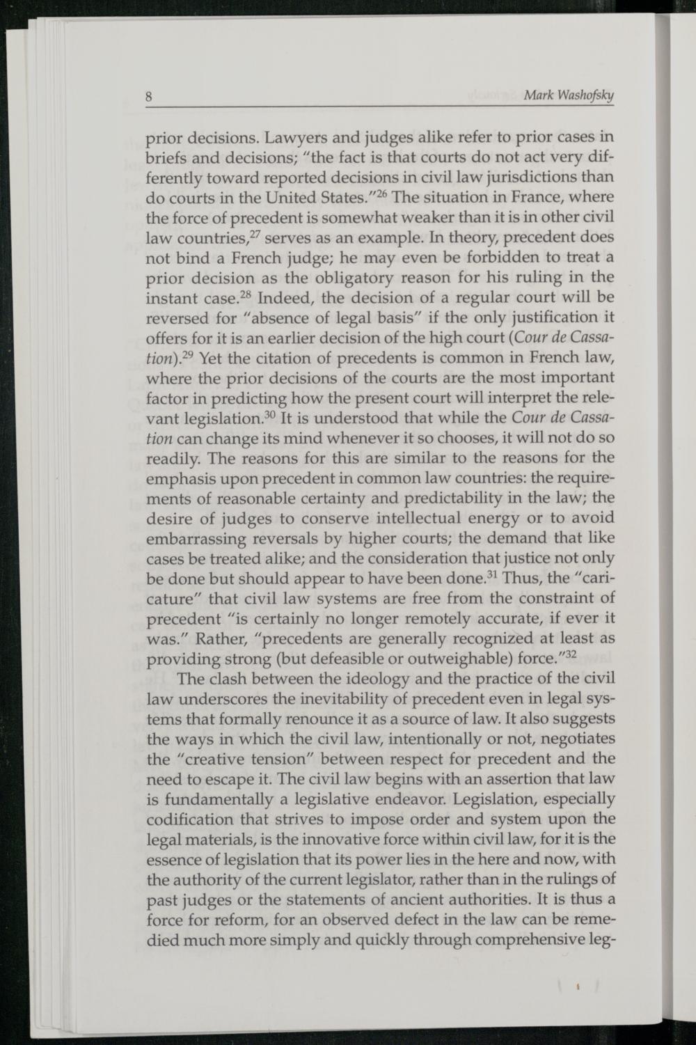The clash between the ideology and the practice of the civil law underscores the inevitability of precedent even in legal systems that formally renounce it as a source of law. It also suggests the ways in which the civil law, intentionally or not, negotiates the“creative tension” between respect for precedent and the need to escape it. The civil law begins with an assertion that law is fundamentally a legislative endeavor. Legislation, especially codification that strives to impose order and system upon the legal materials, is the innovative force within civil law, for it is the essence of legislation that its power lies in the here and now, with the authority of the current legislator, rather than in the rulings of past judges or the statements of ancient authorities. It is thus a force for reform, for an observed defect in the law can be remedied much more simply and quickly through comprehensive leg