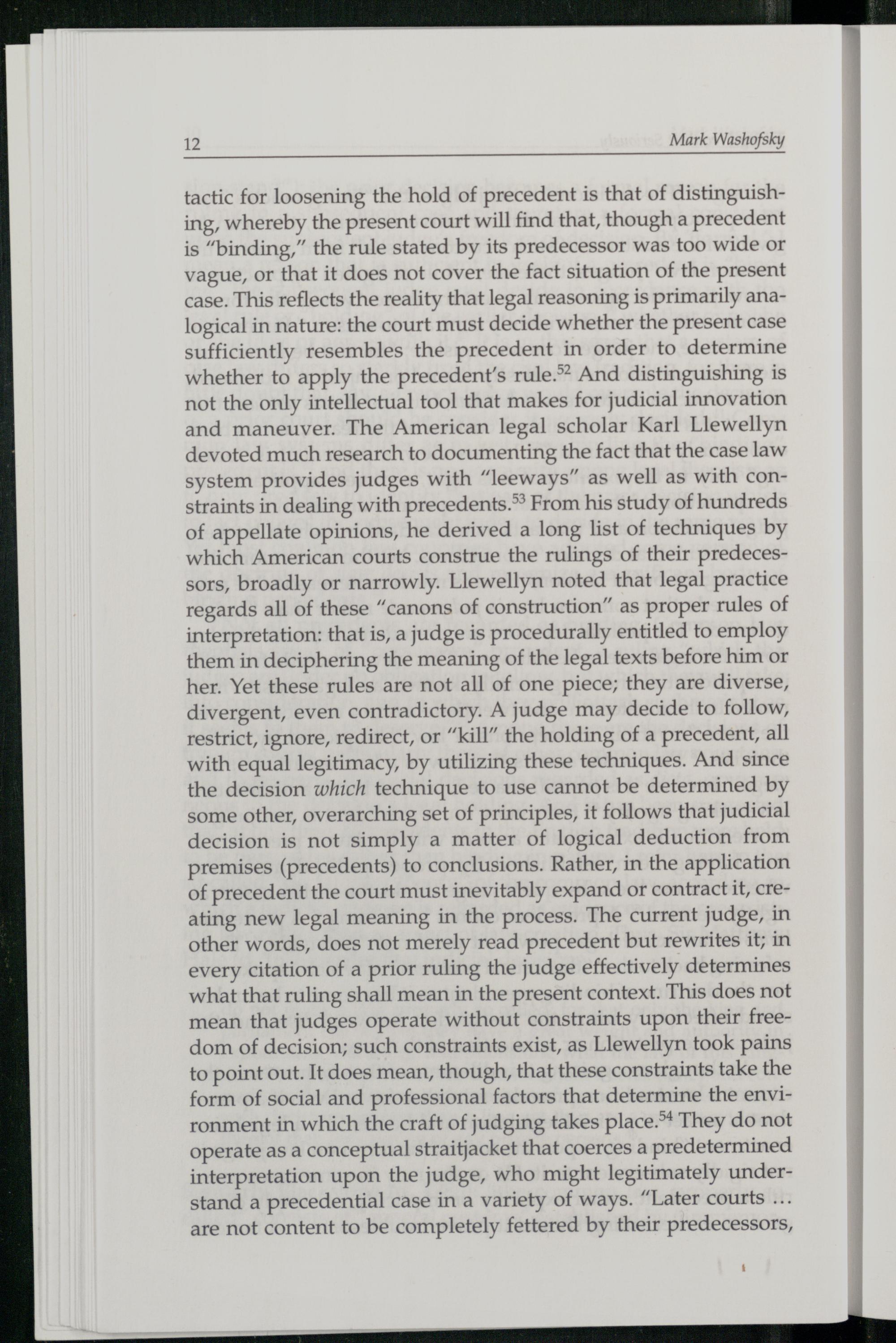 tactic for loosening the hold of precedent is that of distinguishing, whereby the present court will find that, though a precedent is“binding,” the rule stated by its predecessor was too wide or vague, or that it does not cover the fact situation of the present case. This reflects the reality that legal reasoning is primarily analogical in nature: the court must decide whether the present case sufficiently resembles the precedent in order to determine whether to apply the precedent’s rule.” And distinguishing is not the only intellectual tool that makes for judicial innovation and maneuver. The American legal scholar Karl Llewellyn devoted much research to documenting the fact that the case law system provides judges with“leeways” as well as with constraints in dealing with precedents.’® From his study of hundreds of appellate opinions, he derived a long list of techniques by which American courts construe the rulings of their predecessors, broadly or narrowly. Llewellyn noted that legal practice regards all of these“canons of construction” as proper rules of interpretation: that is, a judge is procedurally entitled to employ them in deciphering the meaning of the legal texts before him or her. Yet these rules are not all of one piece; they are diverse, divergent, even contradictory. A judge may decide to follow, restrict, ignore, redirect, or“kill” the holding of a precedent, all with equal legitimacy, by utilizing these techniques. And since the decision which technique to use cannot be determined by some other, overarching set of principles, it follows that judicial decision is not simply a matter of logical deduction from premises(precedents) to conclusions. Rather, in the application of precedent the court must inevitably expand or contract it, creating new legal meaning in the process. The current judge, in other words, does not merely read precedent but rewrites it; in every citation of a prior ruling the judge effectively determines what that ruling shall mean in the present context. This does not mean that judges operate without constraints upon their freedom of decision; such constraints exist, as Llewellyn took pains to point out. It does mean, though, that these constraints take the form of social and professional factors that determine the environment in which the craft of judging takes place.> They do not operate as a conceptual straitjacket that coerces a predetermined interpretation upon the judge, who might legitimately understand a precedential case in a variety of ways.“Later courts... are not content to be completely fettered by their predecessors,