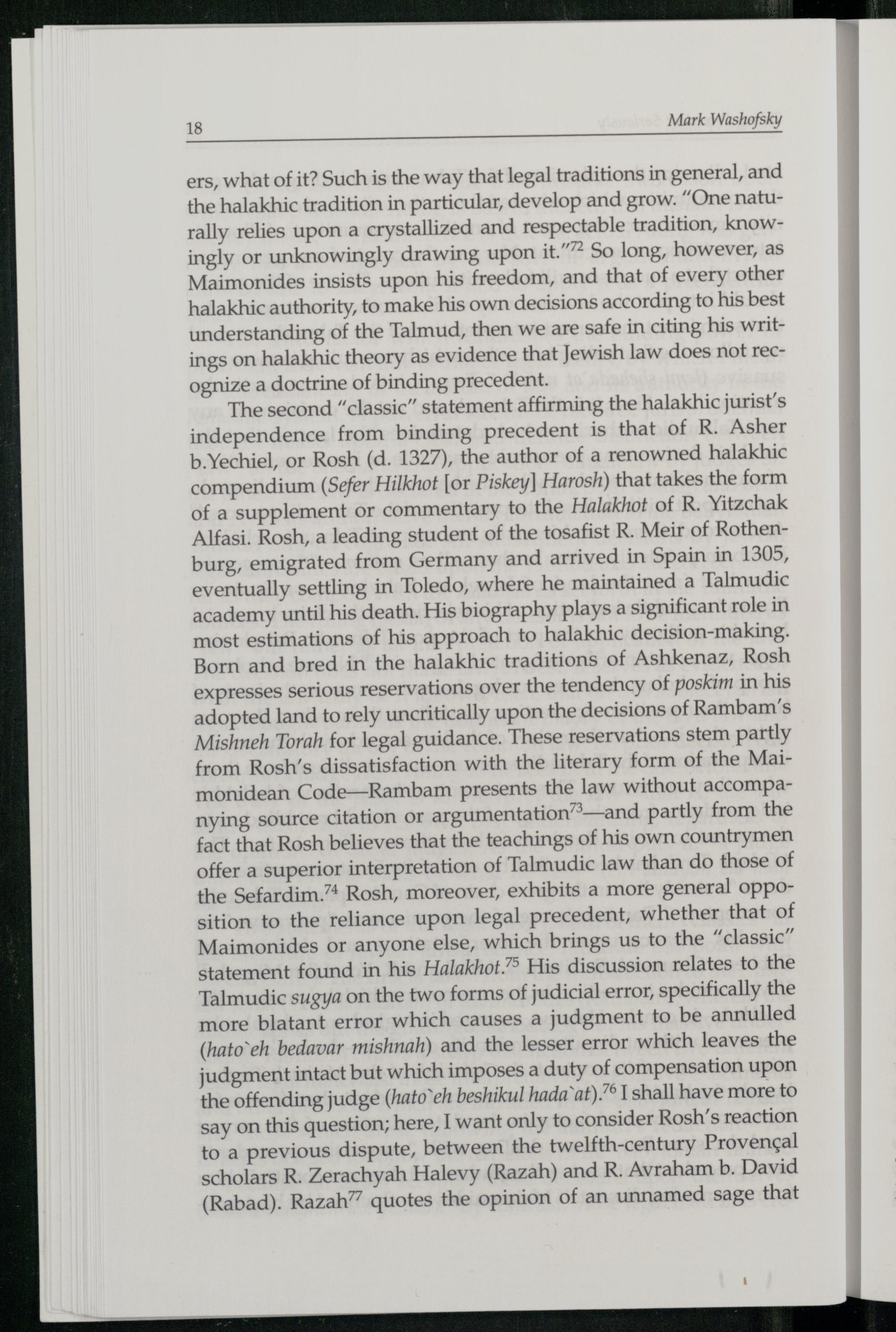The second“classic” statement affirming the halakhic jurist’s independence from binding precedent is that of R. Asher b.Yechiel, or Rosh(d. 1327), the author of a renowned halakhic compendium(Sefer Hilkhot[or Piskey] Harosh) that takes the form of a supplement or commentary to the Halakhot of R. Yitzchak Alfasi. Rosh, a leading student of the tosafist R. Meir of Rothen burg , emigrated from Germany and arrived in Spain in 1305, eventually settling in Toledo, where he maintained a Talmudic academy until his death. His biography plays a significant role in most estimations of his approach to halakhic decision-making. Born and bred in the halakhic traditions of Ashkenaz , Rosh expresses serious reservations over the tendency of poskim in his adopted land to rely uncritically upon the decisions of Rambam '’s Mishneh Torah for legal guidance. These reservations stem partly from Rosh’s dissatisfaction with the literary form of the Maimonidean Code—Rambam presents the law without accompanying source citation or argumentation”’—and partly from the fact that Rosh believes that the teachings of his own countrymen offer a superior interpretation of Talmudic law than do those of the Sefardim .”* Rosh, moreover, exhibits a more general opposition to the reliance upon legal precedent, whether that of Maimonides or anyone else, which brings us to the“classic” statement found in his Halakhot. ”> His discussion relates to the Talmudic sugya on the two forms of judicial error, specifically the more blatant error which causes a judgment to be annulled (hato eh bedavar mishnah) and the lesser error which leaves the judgment intact but which imposes a duty of compensation upon the offending judge(hato’eh beshikul hada’ at).”® 1 shall have more to say on this question; here, I want only to consider Rosh’s reaction to a previous dispute, between the twelfth-century Provencal scholars R. Zerachyah Halevy(Razah) and R. Avraham b. David (Rabad). Razah” quotes the opinion of an unnamed sage that
