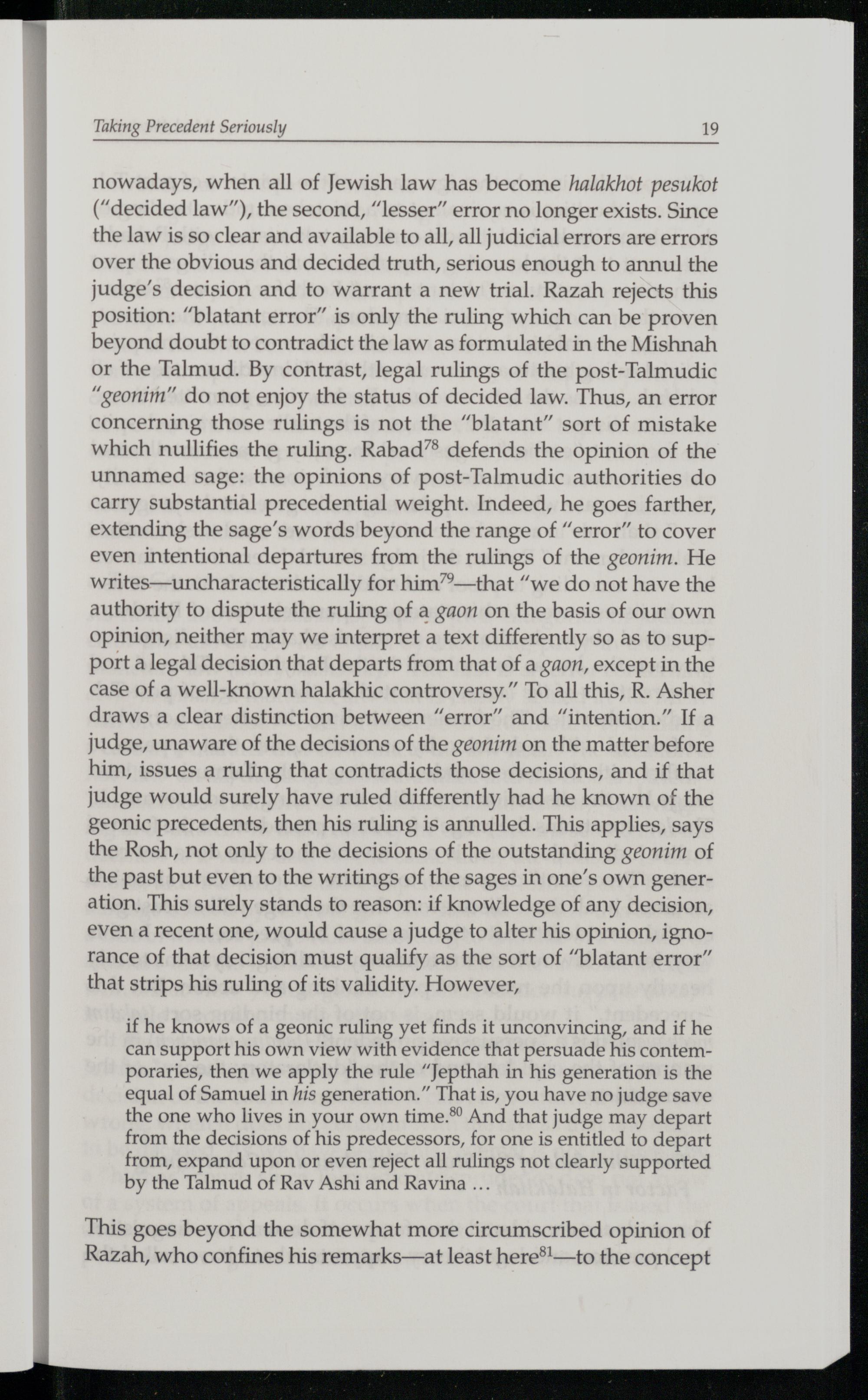 nowadays, when all of Jewish law has become halakhot pesukot (“decided law”), the second,“lesser” error no longer exists. Since the law is so clear and available to all, all judicial errors are errors over the obvious and decided truth, serious enough to annul the judge’s decision and to warrant a new trial. Razah rejects this position:“blatant error” is only the ruling which can be proven beyond doubt to contradict the law as formulated in the Mishnah or the Talmud . By contrast, legal rulings of the post-Talmudic “geonim” do not enjoy the status of decided law. Thus, an error concerning those rulings is not the“blatant” sort of mistake which nullifies the ruling. Rabad”® defends the opinion of the unnamed sage: the opinions of post-Talmudic authorities do carry substantial precedential weight. Indeed, he goes farther, extending the sage’s words beyond the range of“error” to cover even intentional departures from the rulings of the geonim. He writes—uncharacteristically for him”—that“we do not have the authority to dispute the ruling of a gaon on the basis of our own opinion, neither may we interpret a text differently so as to support a legal decision that departs from that of a gaon, except in the case of a well-known halakhic controversy.” To all this, R. Asher draws a clear distinction between“error” and“intention.” If a judge, unaware of the decisions of the geonim on the matter before him, issues a ruling that contradicts those decisions, and if that judge would surely have ruled differently had he known of the geonic precedents, then his ruling is annulled. This applies, says the Rosh , not only to the decisions of the outstanding geonim of the past but even to the writings of the sages in one’s own generation. This surely stands to reason: if knowledge of any decision, even a recent one, would cause a judge to alter his opinion, ignorance of that decision must qualify as the sort of“blatant error” that strips his ruling of its validity. However,