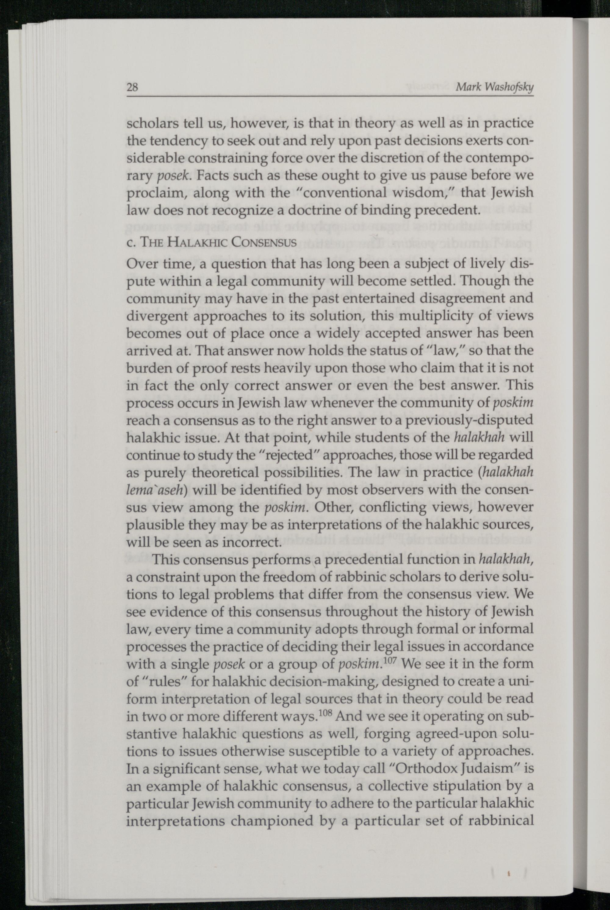 This consensus performs a precedential function in halakhah, a constraint upon the freedom of rabbinic scholars to derive solutions to legal problems that differ from the consensus view. We see evidence of this consensus throughout the history of Jewish law, every time a community adopts through formal or informal processes the practice of deciding their legal issues in accordance with a single posek or a group of poskim.'”” We see it in the form of“rules” for halakhic decision-making, designed to create a uniform interpretation of legal sources that in theory could be read in two or more different ways.!® And we see it operating on substantive halakhic questions as well, forging agreed-upon solutions to issues otherwise susceptible to a variety of approaches. In a significant sense, what we today call“Orthodox Judaism ” is an example of halakhic consensus, a collective stipulation by a particular Jewish community to adhere to the particular halakhic interpretations championed by a particular set of rabbinical