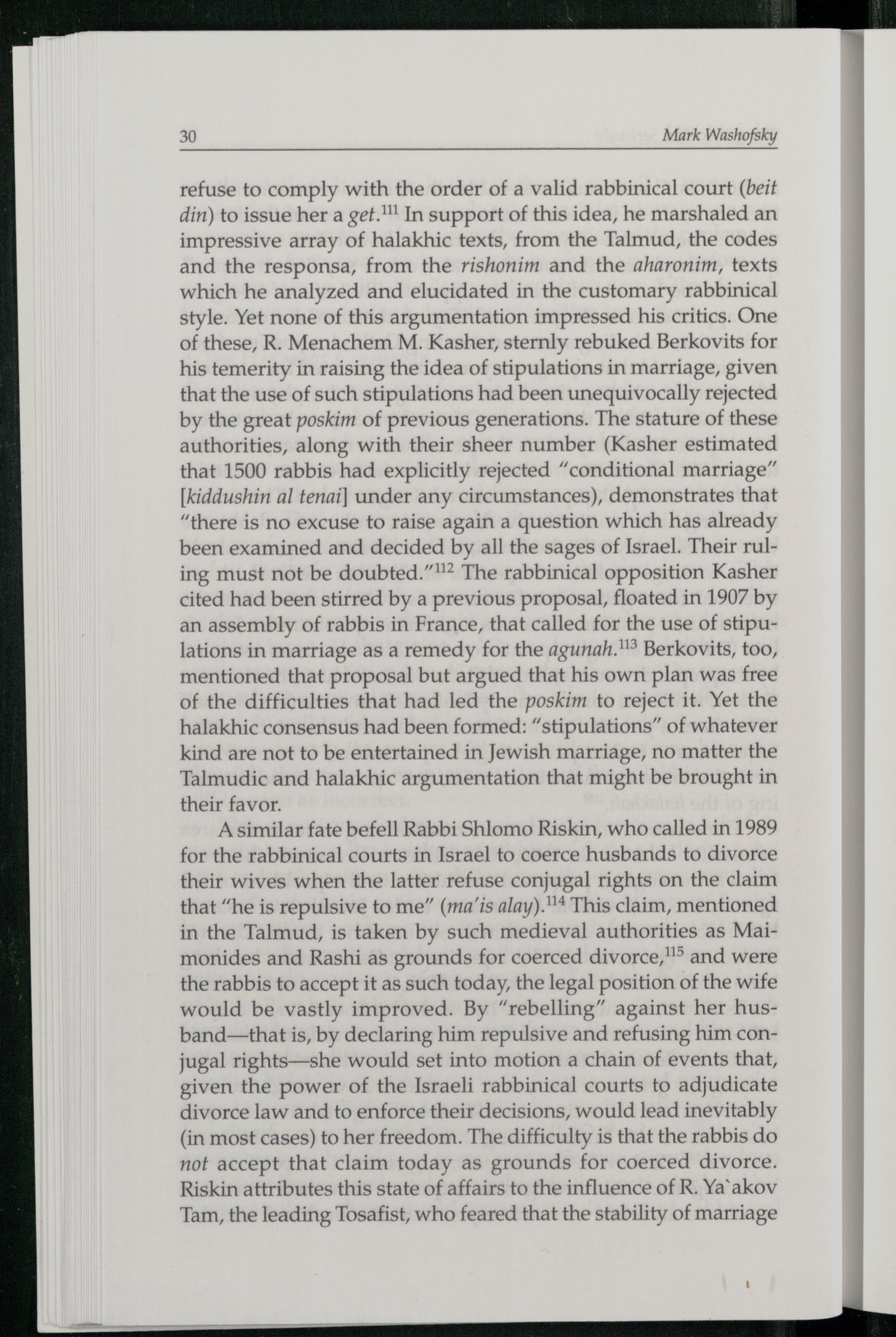 refuse to comply with the order of a valid rabbinical court(beit din) to issue her a get." In support of this idea, he marshaled an impressive array of halakhic texts, from the Talmud , the codes and the responsa, from the rishonim and the aharonim, texts which he analyzed and elucidated in the customary rabbinical style. Yet none of this argumentation impressed his critics. One of these, R. Menachem M. Kasher, sternly rebuked Berkovits for his temerity in raising the idea of stipulations in marriage, given that the use of such stipulations had been unequivocally rejected by the great poskim of previous generations. The stature of these authorities, along with their sheer number(Kasher estimated that 1500 rabbis had explicitly rejected“conditional marriage” [kiddushin al tenai] under any circumstances), demonstrates that “there is no excuse to raise again a question which has already been examined and decided by all the sages of Israel . Their ruling must not be doubted.”""? The rabbinical opposition Kasher cited had been stirred by a previous proposal, floated in 1907 by an assembly of rabbis in France , that called for the use of stipulations in marriage as a remedy for the agunah." Berkovits, too, mentioned that proposal but argued that his own plan was free of the difficulties that had led the poskim to reject it. Yet the halakhic consensus had been formed:“stipulations” of whatever kind are not to be entertained in Jewish marriage, no matter the Talmudic and halakhic argumentation that might be brought in their favor.
