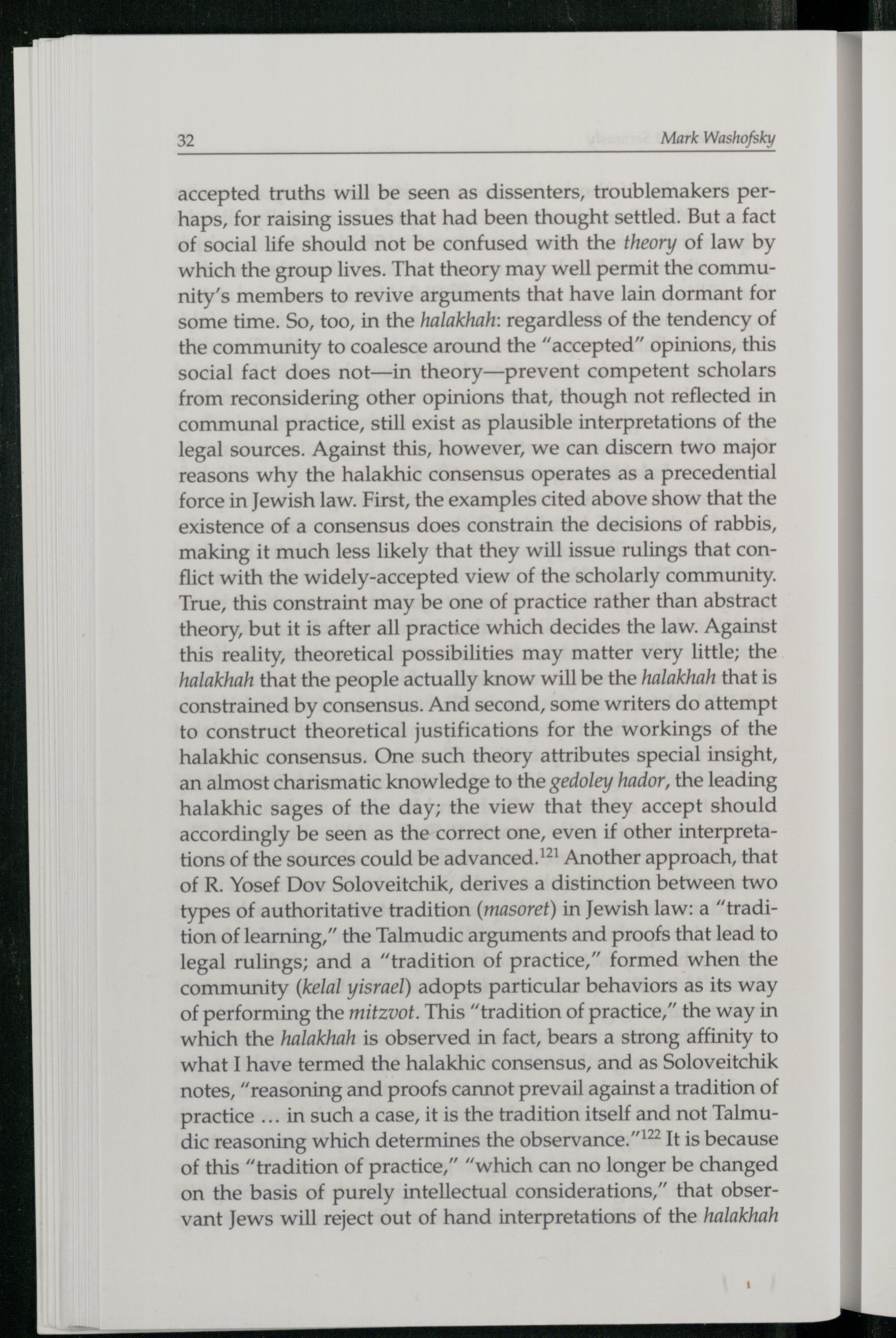 accepted truths will be seen as dissenters, troublemakers perhaps, for raising issues that had been thought settled. But a fact of social life should not be confused with the theory of law by which the group lives. That theory may well permit the community’s members to revive arguments that have lain dormant for some time. So, too, in the halakhah: regardless of the tendency of the community to coalesce around the“accepted” opinions, this social fact does not—in theory—prevent competent scholars from reconsidering other opinions that, though not reflected in communal practice, still exist as plausible interpretations of the legal sources. Against this, however, we can discern two major reasons why the halakhic consensus operates as a precedential force in Jewish law. First, the examples cited above show that the existence of a consensus does constrain the decisions of rabbis, making it much less likely that they will issue rulings that conflict with the widely-accepted view of the scholarly community. True, this constraint may be one of practice rather than abstract theory, but it is after all practice which decides the law. Against this reality, theoretical possibilities may matter very little; the halakhah that the people actually know will be the halakhah that is constrained by consensus. And second, some writers do attempt to construct theoretical justifications for the workings of the halakhic consensus. One such theory attributes special insight, an almost charismatic knowledge to the gedoley hador, the leading halakhic sages of the day; the view that they accept should accordingly be seen as the correct one, even if other interpretations of the sources could be advanced.'?! Another approach, that of R. Yosef Dov Soloveitchik, derives a distinction between two types of authoritative tradition(masoret) in Jewish law: a“tradition of learning,” the Talmudic arguments and proofs that lead to legal rulings; and a“tradition of practice,” formed when the community(kelal yisrael) adopts particular behaviors as its way of performing the mitzvot. This“tradition of practice,” the way in which the halakhah is observed in fact, bears a strong affinity to what I have termed the halakhic consensus, and as Soloveitchik notes,“reasoning and proofs cannot prevail against a tradition of practice... in such a case, it is the tradition itself and not Talmudic reasoning which determines the observance.” It is because of this“tradition of practice,”“which can no longer be changed on the basis of purely intellectual considerations,” that observant Jews will reject out of hand interpretations of the halakhah