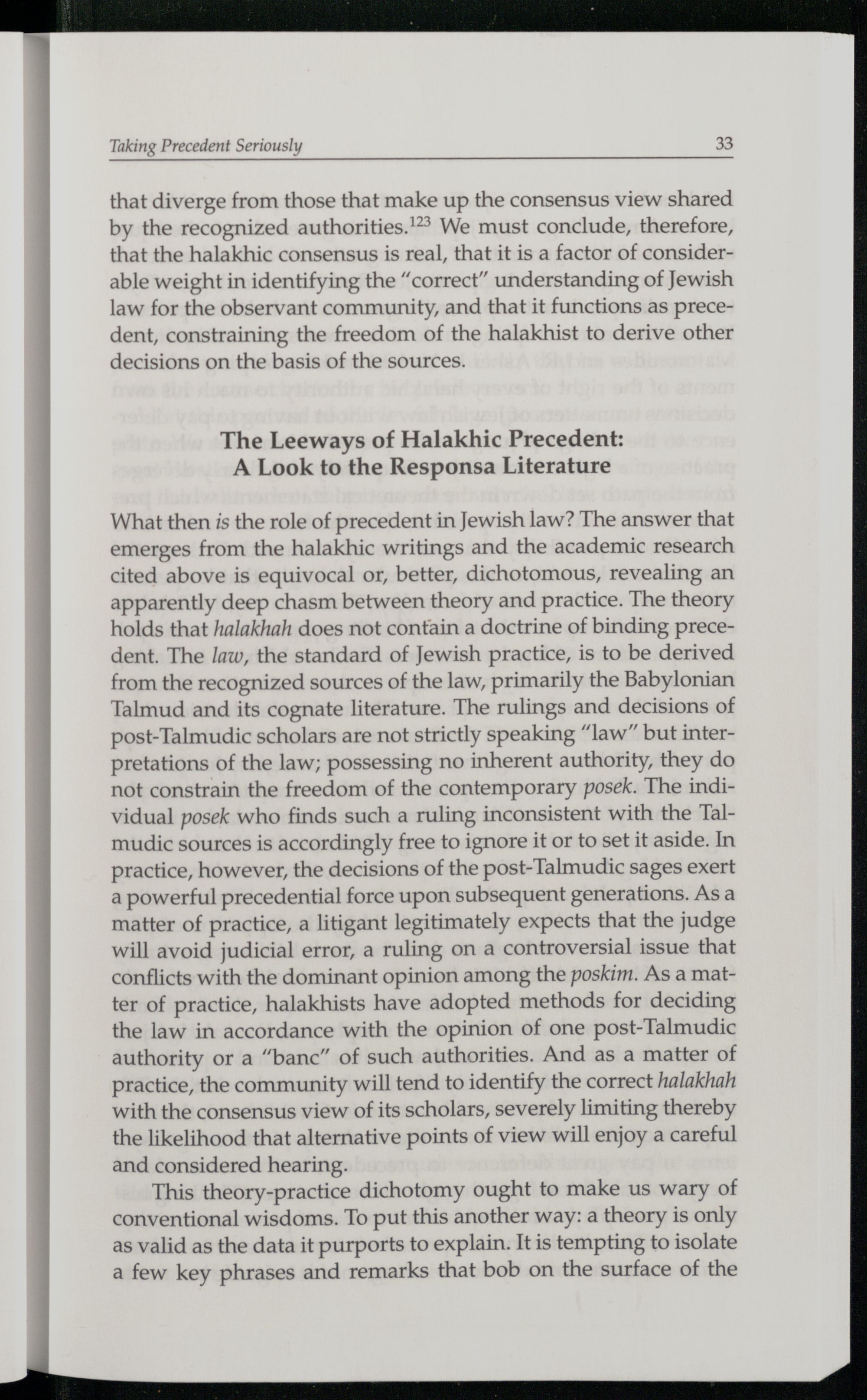 that diverge from those that make up the consensus view shared by the recognized authorities.!” We must conclude, therefore, that the halakhic consensus is real, that it is a factor of considerable weight in identifying the“correct” understanding of Jewish law for the observant community, and that it functions as precedent, constraining the freedom of the halakhist to derive other decisions on the basis of the sources.