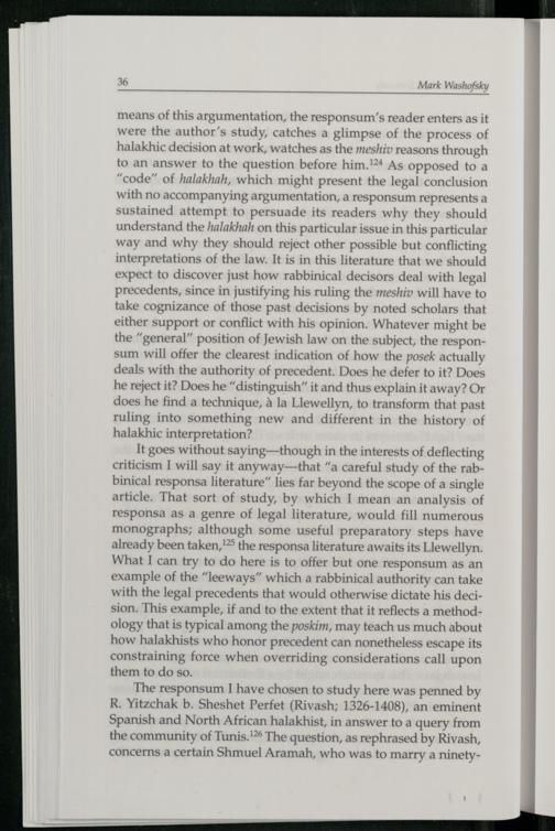 It goes without saying—though in the interests of deflecting criticism I will say it anyway—that“a careful study of the rabbinical responsa literature” lies far beyond the scope of a single article. That sort of study, by which I mean an analysis of responsa as a genre of legal literature, would fill numerous monographs; although some useful preparatory steps have already been taken,'® the responsa literature awaits its Llewellyn. What I can try to do here is to offer but one responsum as an example of the“leeways” which a rabbinical authority can take with the legal precedents that would otherwise dictate his decision. This example, if and to the extent that it reflects a methodology that is typical among the poskim, may teach us much about how halakhists who honor precedent can nonetheless escape its constraining force when overriding considerations call upon them to do so.