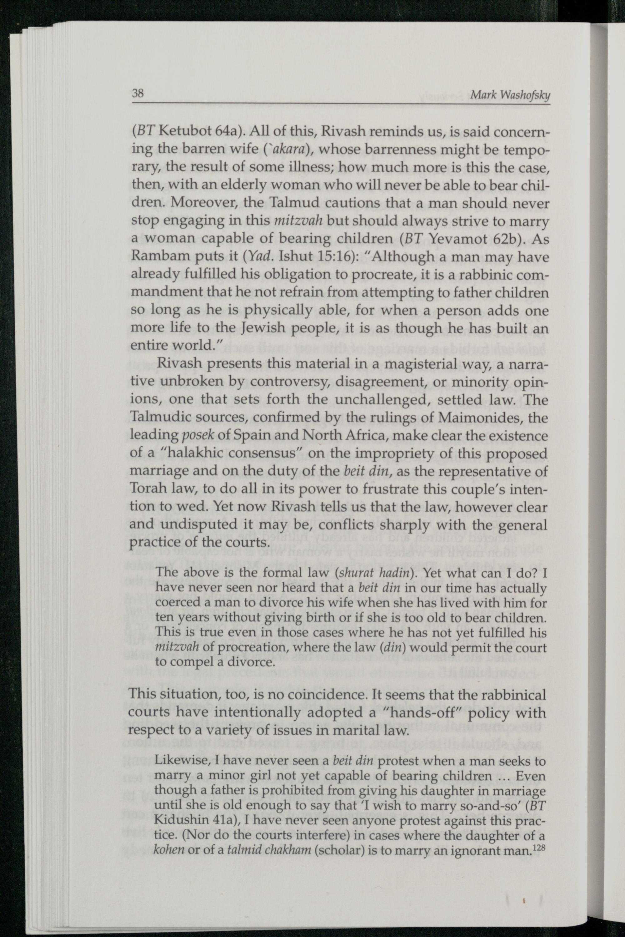 Rivash presents this material in a magisterial way, a narrative unbroken by controversy, disagreement, or minority opinions, one that sets forth the unchallenged, settled law. The Talmudic sources, confirmed by the rulings of Maimonides , the leading posek of Spain and North Africa , make clear the existence of a“halakhic consensus” on the impropriety of this proposed marriage and on the duty of the beit din, as the representative of Torah law, to do all in its power to frustrate this couple’s intention to wed. Yet now Rivash tells us that the law, however clear and undisputed it may be, conflicts sharply with the general practice of the courts.