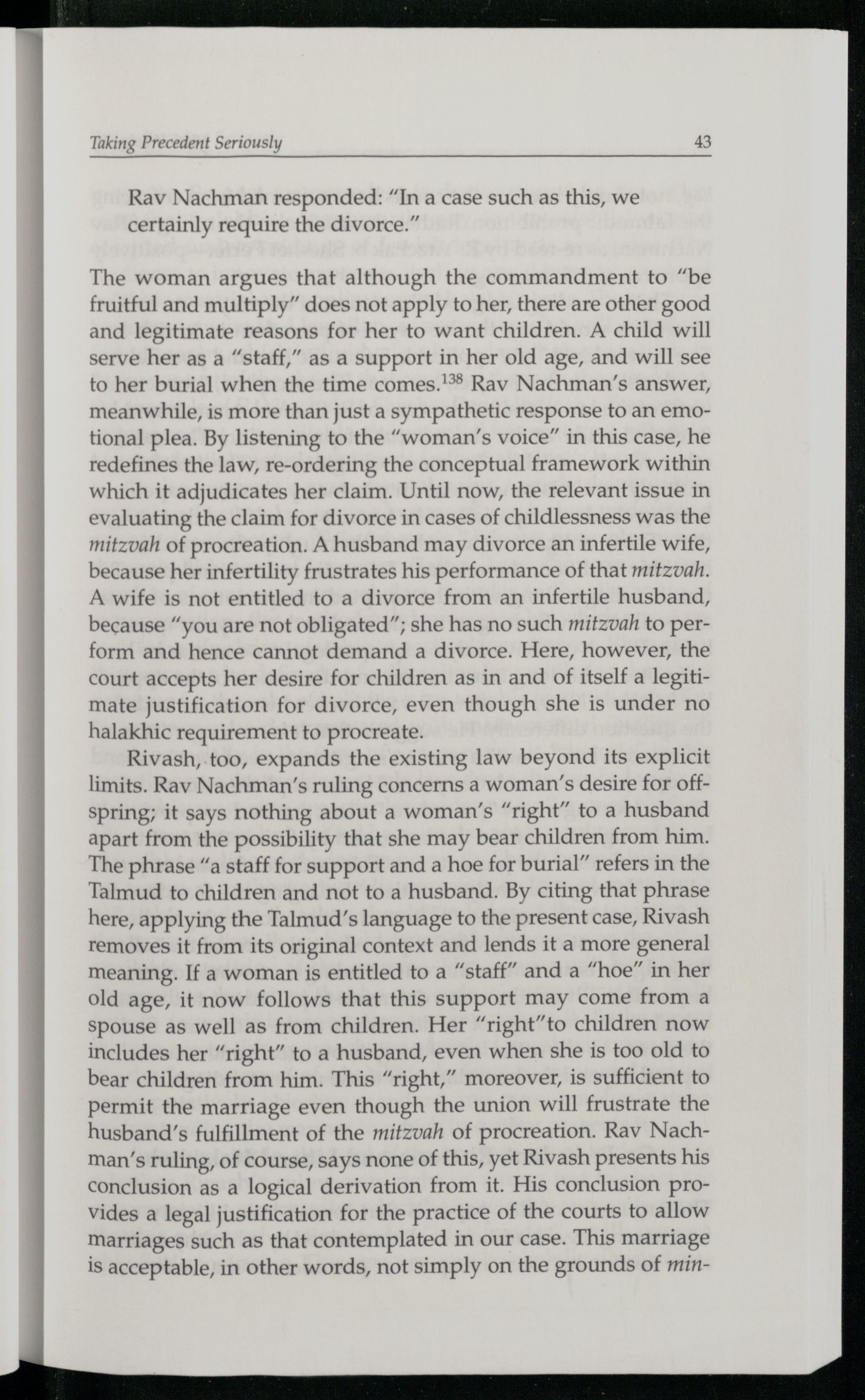 The woman argues that although the commandment to“be fruitful and multiply” does not apply to her, there are other good and legitimate reasons for her to want children. A child will serve her as a“staff,” as a support in her old age, and will see to her burial when the time comes.!?® Rav Nachman’s answer, meanwhile, is more than just a sympathetic response to an emotional plea. By listening to the“woman’s voice” in this case, he redefines the law, re-ordering the conceptual framework within which it adjudicates her claim. Until now, the relevant issue in evaluating the claim for divorce in cases of childlessness was the mitzvah of procreation. A husband may divorce an infertile wife, because her infertility frustrates his performance of that mitzvah. A wife is not entitled to a divorce from an infertile husband, because“you are not obligated”; she has no such mitzvah to perform and hence cannot demand a divorce. Here, however, the court accepts her desire for children as in and of itself a legitimate justification for divorce, even though she is under no halakhic requirement to procreate.