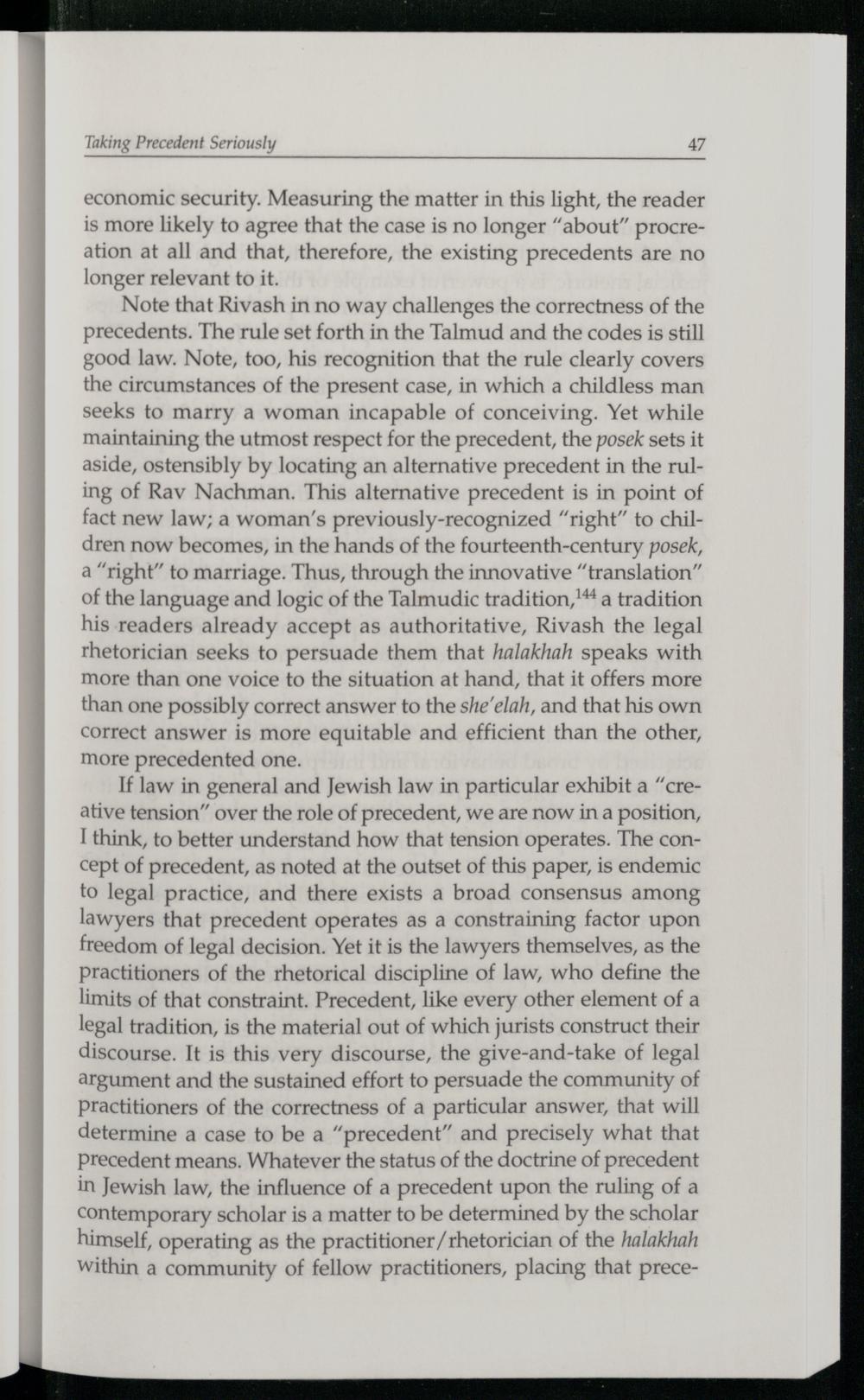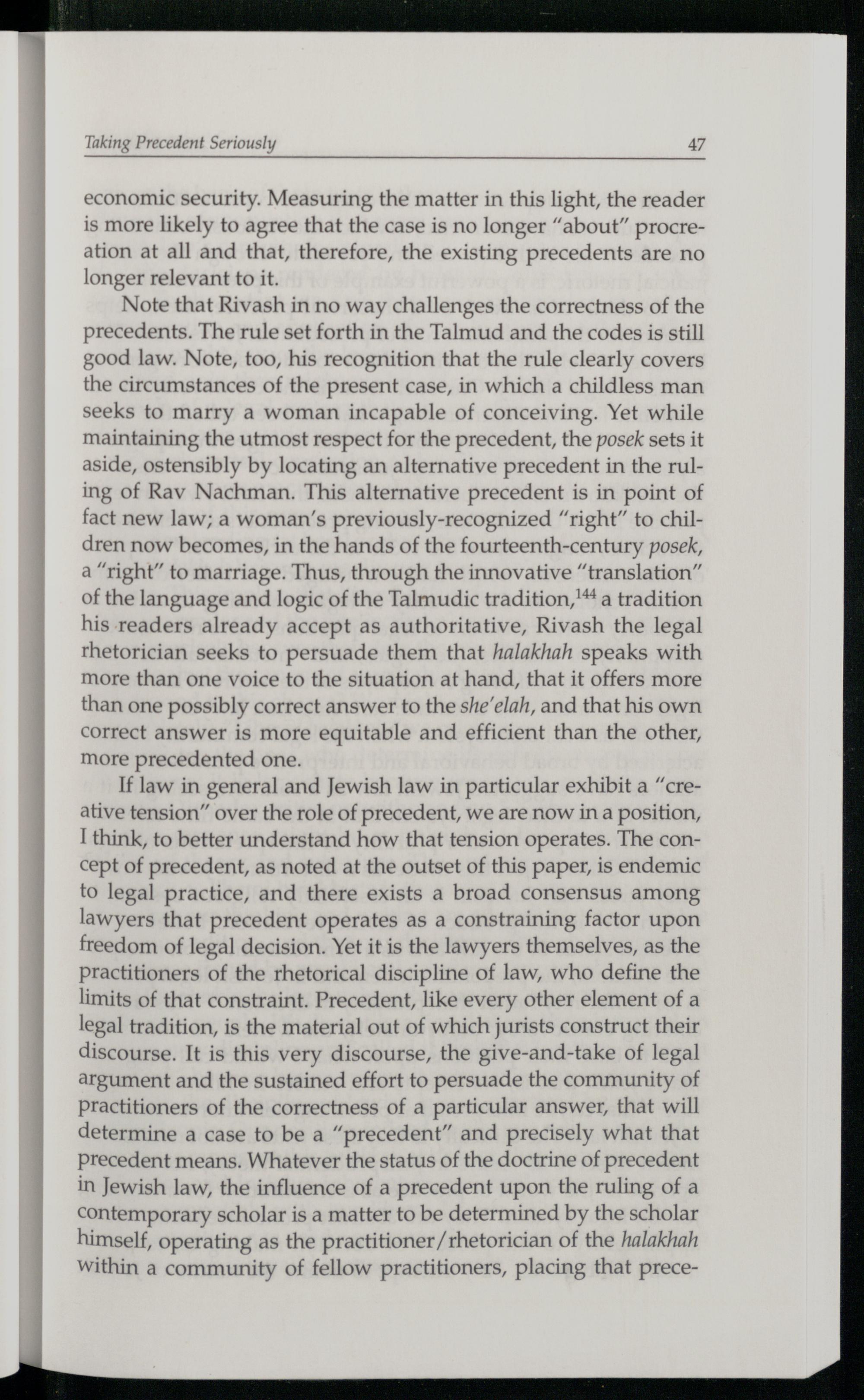 Note that Rivash in no way challenges the correctness of the precedents. The rule set forth in the Talmud and the codes is still good law. Note, too, his recognition that the rule clearly covers the circumstances of the present case, in which a childless man seeks to marry a woman incapable of conceiving. Yet while maintaining the utmost respect for the precedent, the posek sets it aside, ostensibly by locating an alternative precedent in the rul­ing of Rav Nachman. This alternative precedent is in point of fact new law; a woman's previously-recognizedright to chil­dren now becomes, in the hands of the fourteenth-century posek, aright to marriage. Thus, through the innovativetranslation of the language and logic of the Talmudic tradition,'* a tradition his readers already accept as authoritative, Rivash the legal rhetorician seeks to persuade them that halakhah speaks with more than one voice to the situation at hand, that it offers more than one possibly correct answer to the sheelah, and that his own correct answer is more equitable and efficient than the other, more precedented one.