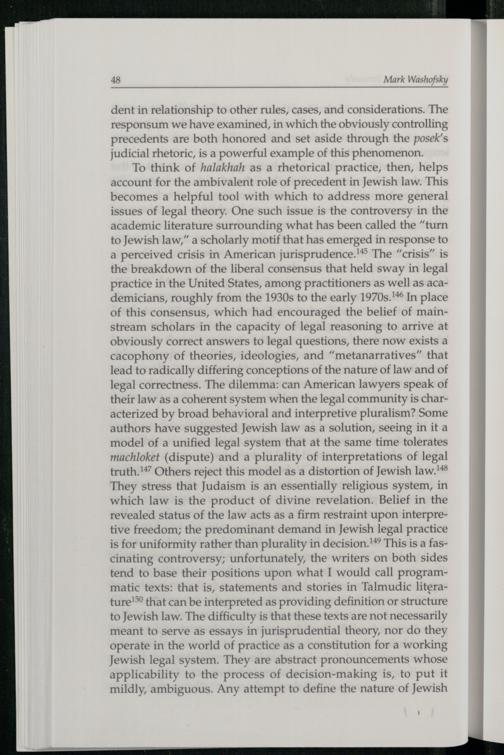 To think of halakhah as a rhetorical practice, then, helps account for the ambivalent role of precedent in Jewish law. This becomes a helpful tool with which to address more general issues of legal theory. One such issue is the controversy in the academic literature surrounding what has been called the“turn to Jewish law,” a scholarly motif that has emerged in response to a perceived crisis in American jurisprudence.’ The“crisis” is the breakdown of the liberal consensus that held sway in legal practice in the United States , among practitioners as well as academicians, roughly from the 1930s to the early 1970s.1% In place of this consensus, which had encouraged the belief of mainstream scholars in the capacity of legal reasoning to arrive at obviously correct answers to legal questions, there now exists a cacophony of theories, ideologies, and“metanarratives” that lead to radically differing conceptions of the nature of law and of legal correctness. The dilemma: can American lawyers speak of their law as a coherent system when the legal community is characterized by broad behavioral and interpretive pluralism? Some authors have suggested Jewish law as a solution, seeing in it a model of a unified legal system that at the same time tolerates machloket(dispute) and a plurality of interpretations of legal truth.'¥” Others reject this model as a distortion of Jewish law. They stress that Judaism is an essentially religious system , in which law is the product of divine revelation. Belief in the revealed status of the law acts as a firm restraint upon interpretive freedom; the predominant demand in Jewish legal practice is for uniformity rather than plurality in decision.!*® This is a fascinating controversy; unfortunately, the writers on both sides tend to base their positions upon what I would call programmatic texts: that is, statements and stories in Talmudic literature! that can be interpreted as providing definition or structure to Jewish law. The difficulty is that these texts are not necessarily meant to serve as essays in jurisprudential theory, nor do they operate in the world of practice as a constitution for a working Jewish legal system. They are abstract pronouncements whose applicability to the process of decision-making is, to put it mildly, ambiguous. Any attempt to define the nature of Jewish