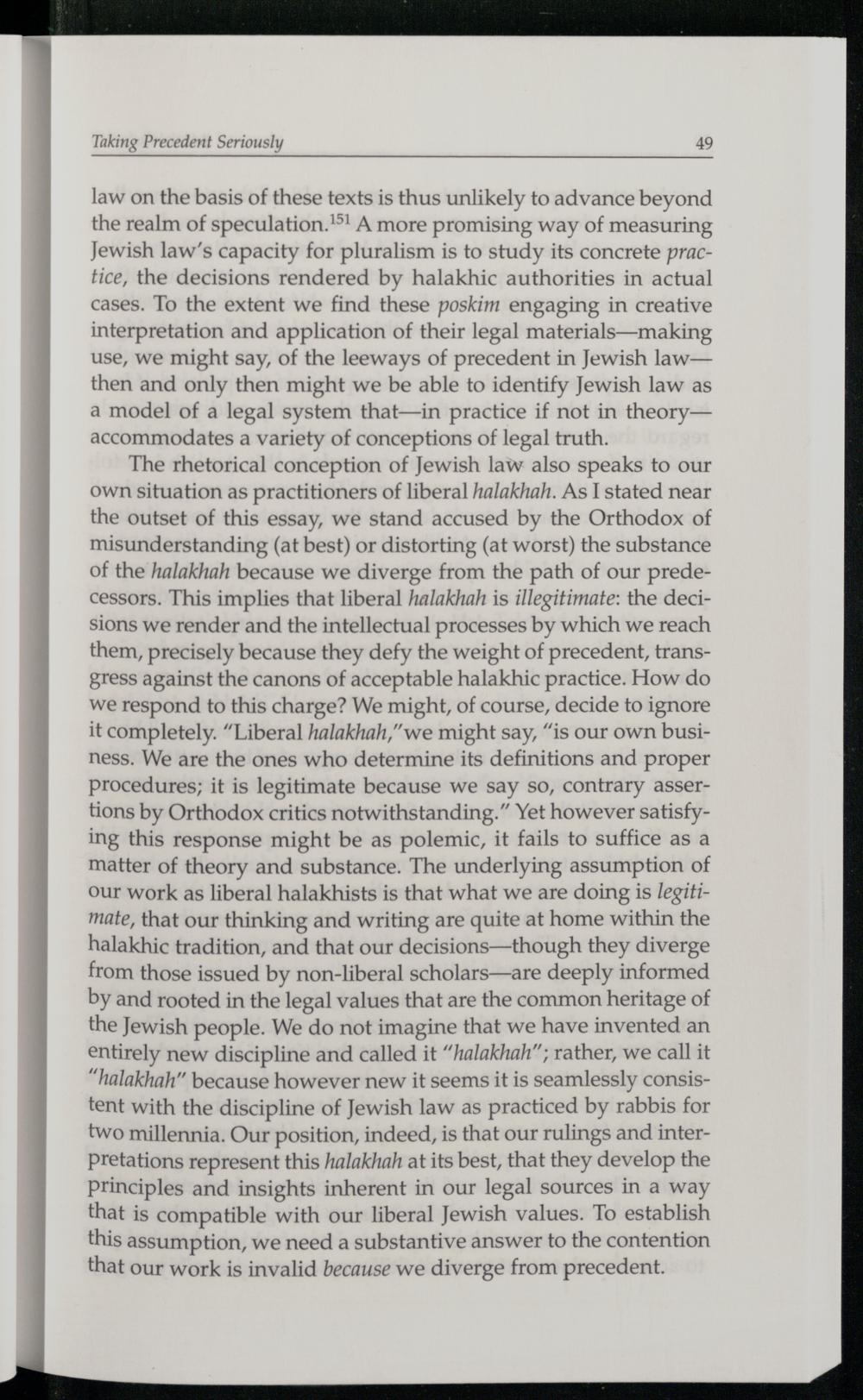 law on the basis of these texts is thus unlikely to advance beyond the realm of speculation.’”! A more promising way of measuring Jewish law’s capacity for pluralism is to study its concrete practice, the decisions rendered by halakhic authorities in actual cases. To the extent we find these poskim engaging in creative interpretation and application of their legal materials—making use, we might say, of the leeways of precedent in Jewish law— then and only then might we be able to identify Jewish law as a model of a legal system that—in practice if not in theory— accommodates a variety of conceptions of legal truth.