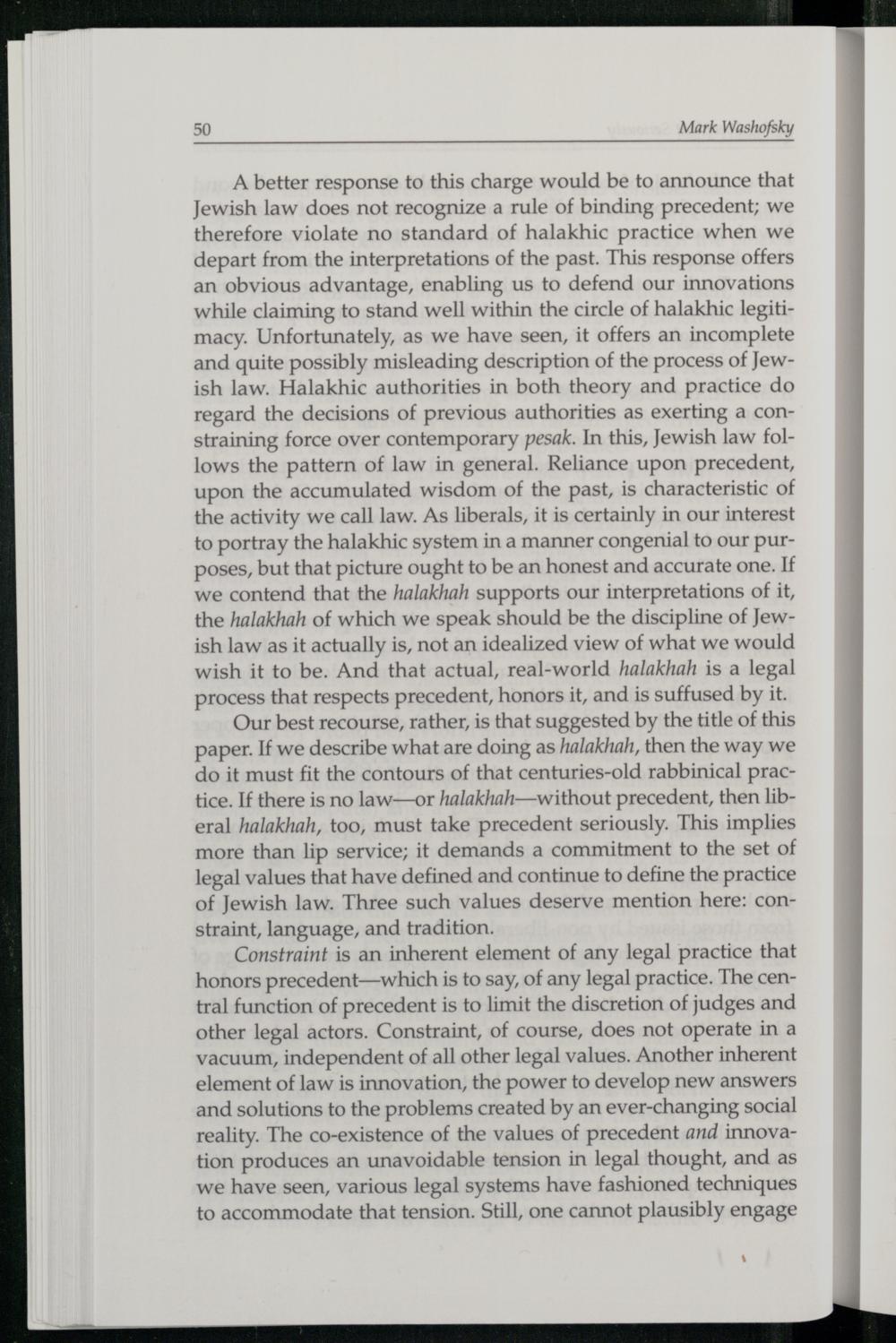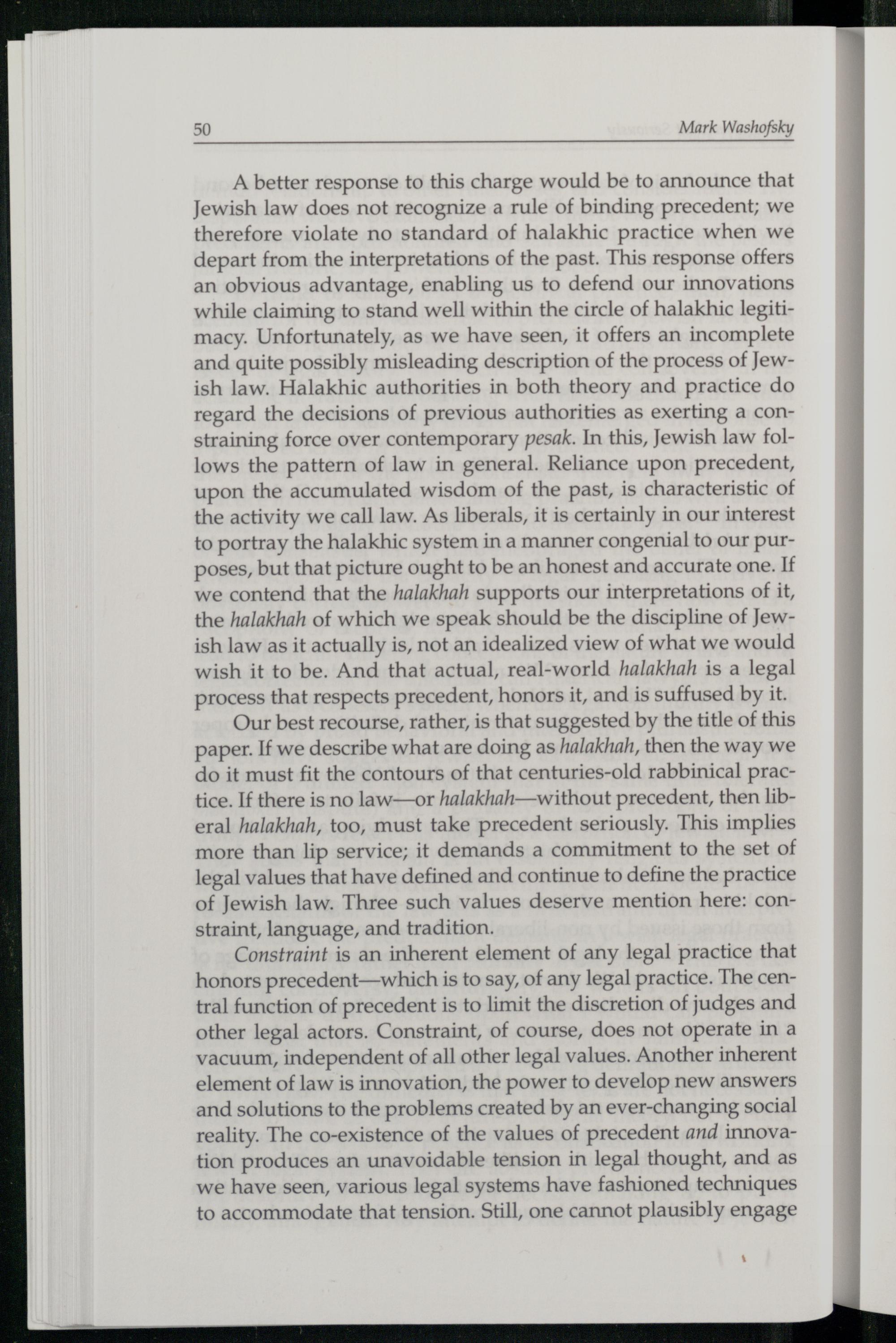 Our best recourse, rather, is that suggested by the title of this paper. If we describe what are doing as halakhah, then the way we do it must fit the contours of that centuries-old rabbinical practice. If there is no law—or halakhah—without precedent, then liberal halakhah, too, must take precedent seriously. This implies more than lip service; it demands a commitment to the set of legal values that have defined and continue to define the practice of Jewish law. Three such values deserve mention here: constraint, language, and tradition.