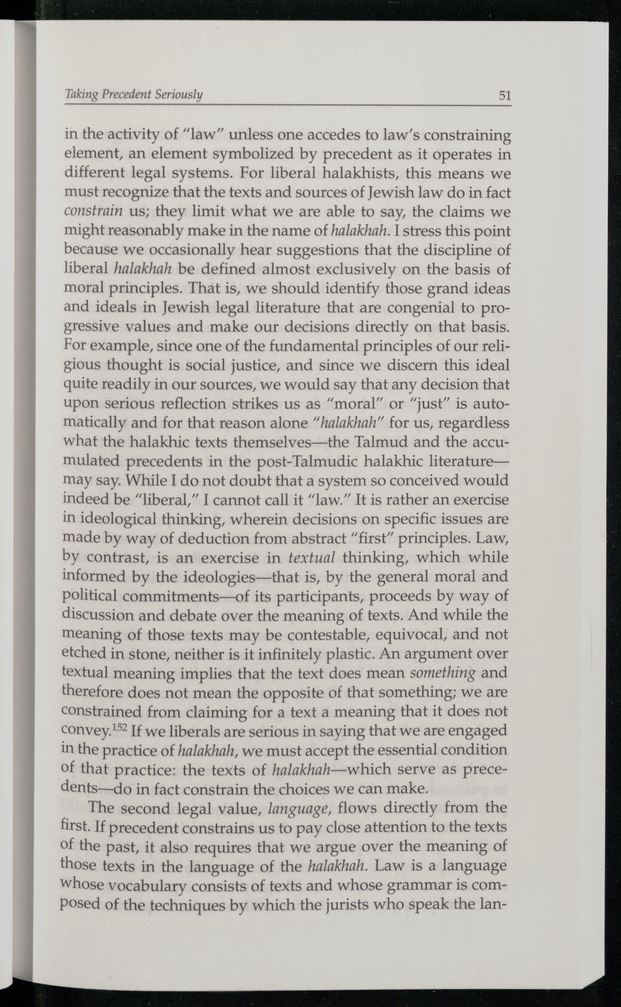 in the activity of“law” unless one accedes to law’s constraining element, an element symbolized by precedent as it operates in different legal systems. For liberal halakhists, this means we must recognize that the texts and sources of Jewish law do in fact constrain us; they limit what we are able to say, the claims we might reasonably make in the name of halakhah. 1 stress this point because we occasionally hear suggestions that the discipline of liberal halakhah be defined almost exclusively on the basis of moral principles. That is, we should identify those grand ideas and ideals in Jewish legal literature that are congenial to progressive values and make our decisions directly on that basis. For example, since one of the fundamental principles of our religious thought is social justice, and since we discern this ideal quite readily in our sources, we would say that any decision that upon serious reflection strikes us as“moral” or“just” is automatically and for that reason alone“halakhah” for us, regardless what the halakhic texts themselves—the Talmud and the accumulated precedents in the post-Talmudic halakhic literature— may say. While I do not doubt that a system so conceived would indeed be“liberal,” I cannot call it“law.” It is rather an exercise in ideological thinking, wherein decisions on specific issues are made by way of deduction from abstract“first” principles. Law, by contrast, is an exercise in textual thinking, which while informed by the ideologies—that is, by the general moral and political commitments—of its participants, proceeds by way of discussion and debate over the meaning of texts. And while the meaning of those texts may be contestable, equivocal, and not etched in stone, neither is it infinitely plastic. An argument over textual meaning implies that the text does mean something and therefore does not mean the opposite of that something; we are constrained from claiming for a text a meaning that it does not convey.'>? If we liberals are serious in saying that we are engaged in the practice of halakhah, we must accept the essential condition of that practice: the texts of halakhah—which serve as precedents—do in fact constrain the choices we can make.