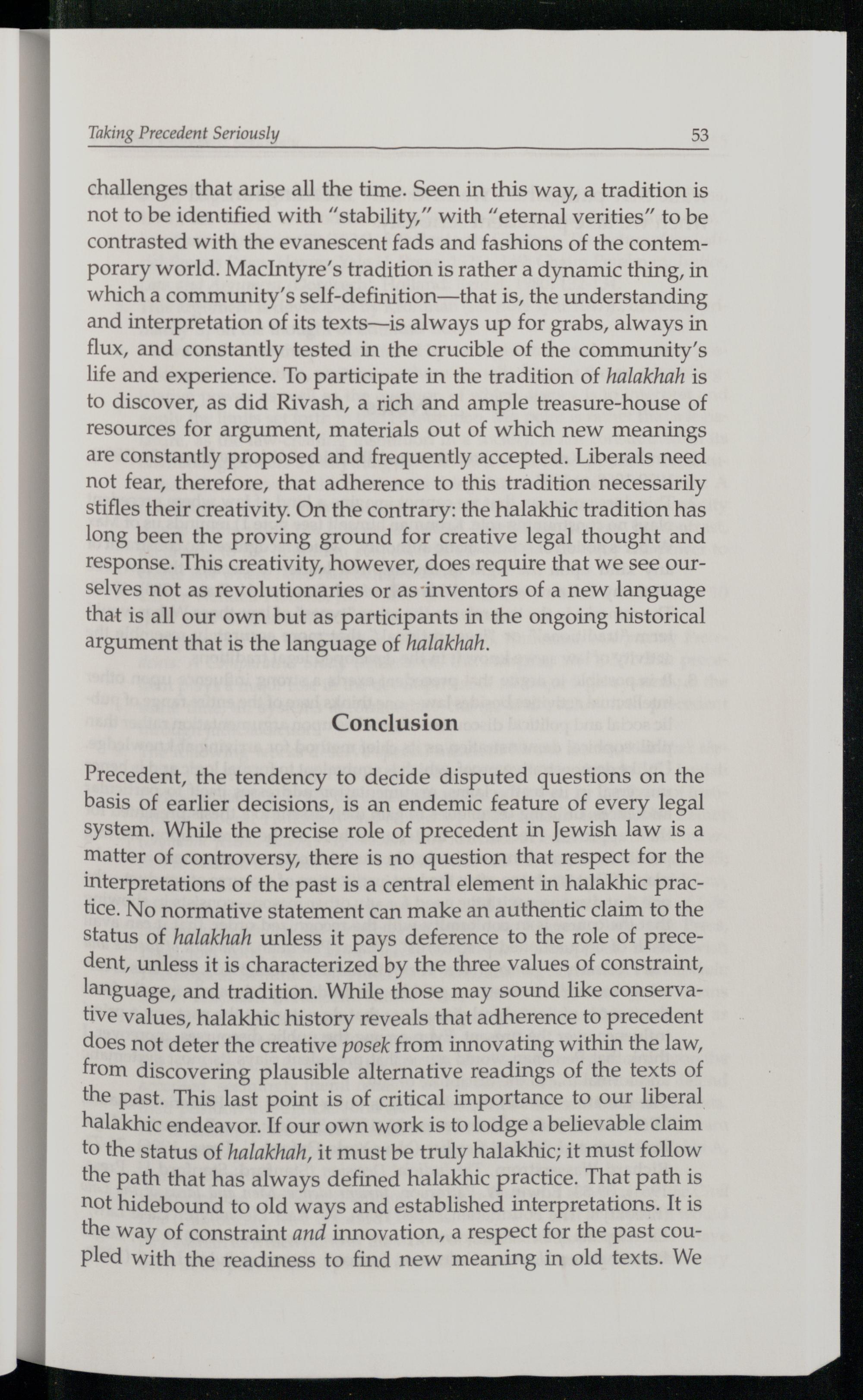 Precedent, the tendency to decide disputed questions on the basis of earlier decisions, is an endemic feature of every legal system. While the precise role of precedent in Jewish law is a matter of controversy, there is no question that respect for the interpretations of the past is a central element in halakhic practice. No normative statement can make an authentic claim to the status of halakhah unless it pays deference to the role of precedent, unless it is characterized by the three values of constraint, language, and tradition. While those may sound like conservative values, halakhic history reveals that adherence to precedent does not deter the creative posek from innovating within the law, from discovering plausible alternative readings of the texts of the past. This last point is of critical importance to our liberal halakhic endeavor. If our own work is to lodge a believable claim to the status of halakhah, it must be truly halakhic; it must follow the path that has always defined halakhic practice. That path is not hidebound to old ways and established interpretations. It is the way of constraint and innovation, a respect for the past coupled with the readiness to find new meaning in old texts. We