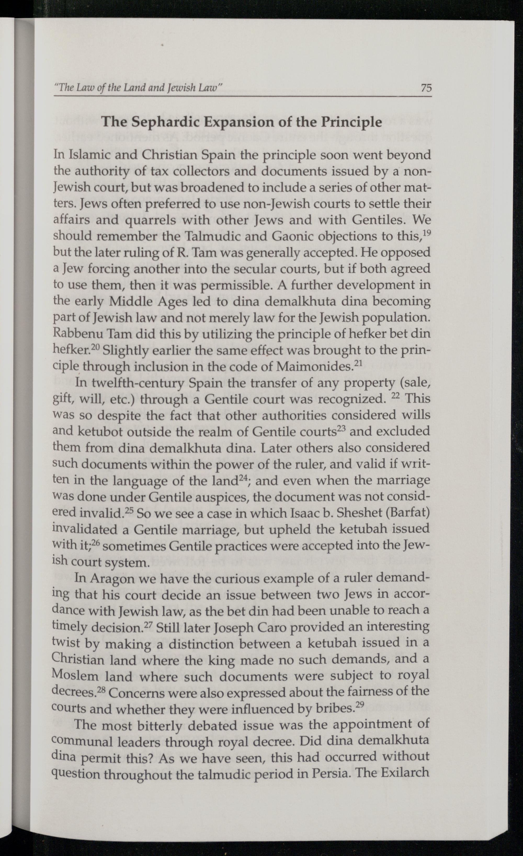 In Islamic and Christian Spain the principle soon went beyond the authority of tax collectors and documents issued by a nonJewish court, but was broadened to include a series of other matters. Jews often preferred to use non-Jewish courts to settle their affairs and quarrels with other Jews and with Gentiles. We should remember the Talmudic and Gaonic objections to this," but the later ruling of R. Tam was generally accepted. He opposed a Jew forcing another into the secular courts, but if both agreed to use them, then it was permissible. A further development in the early Middle Ages led to dina demalkhuta dina becoming part of Jewish law and not merely law for the Jewish population. Rabbenu Tam did this by utilizing the principle of hefker bet din hefker.2 Slightly earlier the same effect was brought to the principle through inclusion in the code of Maimonides. ?!