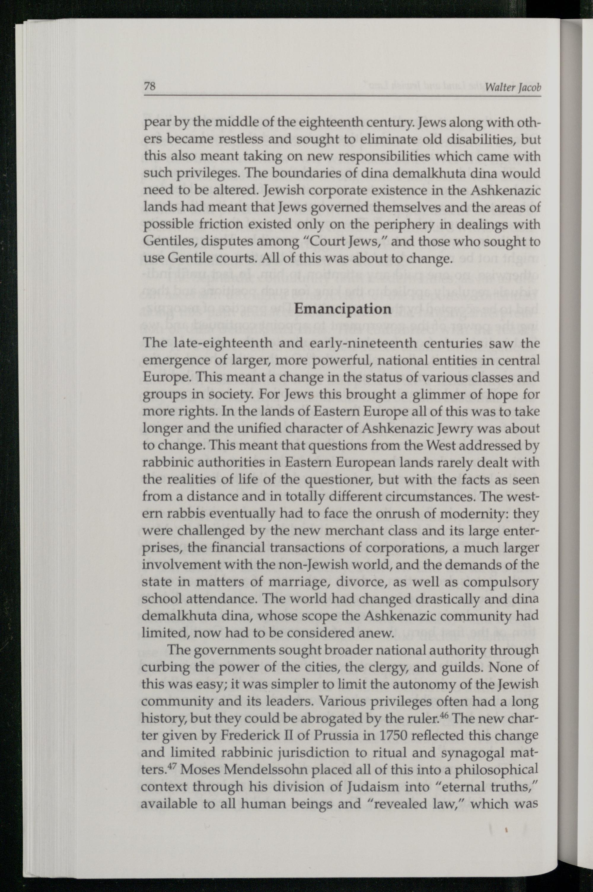 The governments sought broader national authority through curbing the power of the cities, the clergy, and guilds. None of this was easy; it was simpler to limit the autonomy of the Jewish community and its leaders. Various privileges often had a long history, but they could be abrogated by the ruler. The new charter given by Frederick II of Prussia in 1750 reflected this change and limited rabbinic jurisdiction to ritual and synagogal matters.” Moses Mendelssohn placed all of this into a philosophical context through his division of Judaism into“eternal truths,” available to all human beings and“revealed law,” which was
