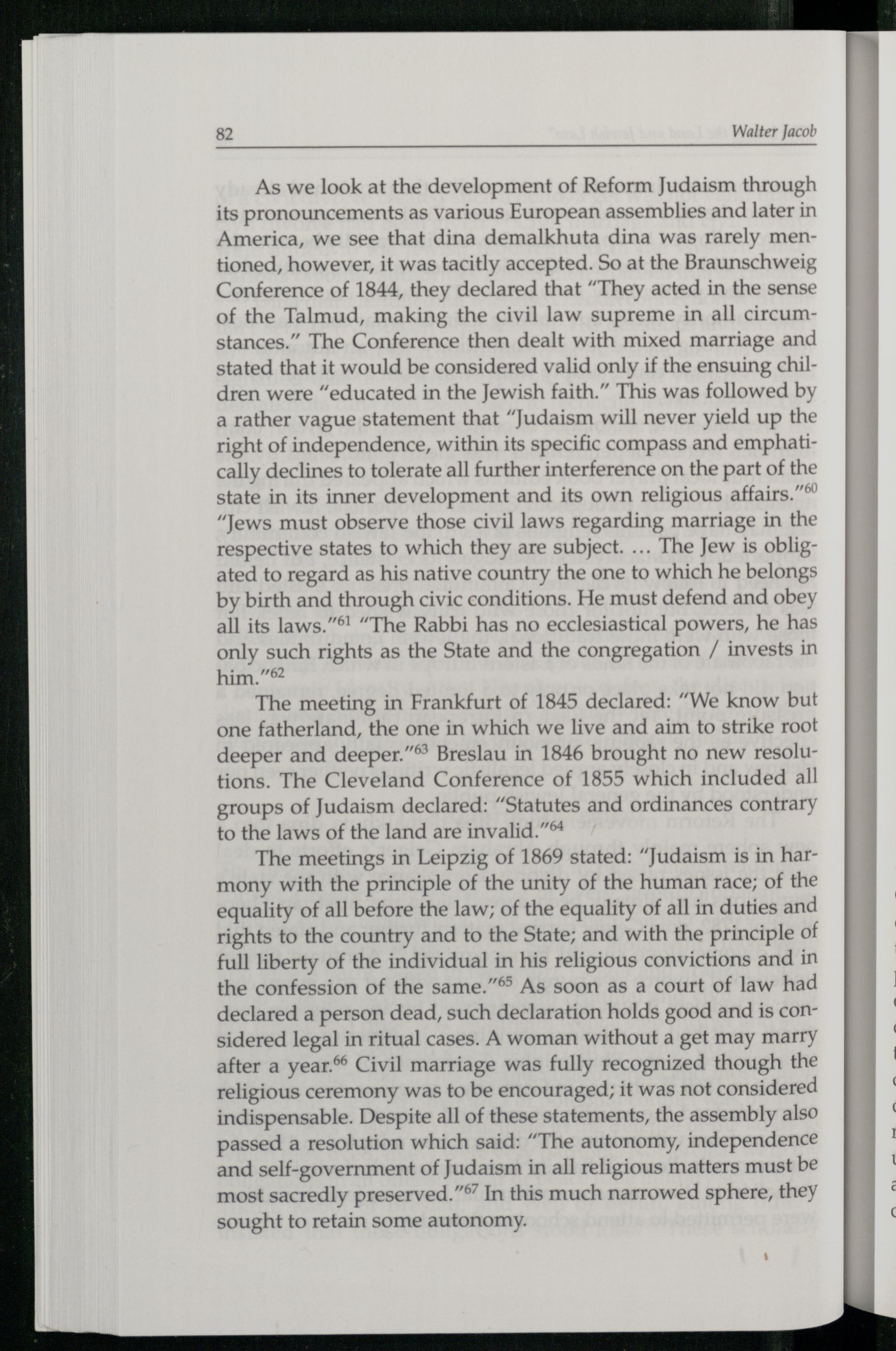 As we look at the development of Reform Judaism through its pronouncements as various European assemblies and later in America , we see that dina demalkhuta dina was rarely mentioned, however, it was tacitly accepted. So at the Braunschweig Conference of 1844, they declared that“They acted in the sense of the Talmud , making the civil law supreme in all circumstances.” The Conference then dealt with mixed marriage and stated that it would be considered valid only if the ensuing children were“educated in the Jewish faith.” This was followed by a rather vague statement that“Judaism will never yield up the right of independence, within its specific compass and emphatically declines to tolerate all further interference on the part of the state in its inner development and its own religious affairs.”* “Jews must observe those civil laws regarding marriage in the respective states to which they are subject.... The Jew is obligated to regard as his native country the one to which he belongs by birth and through civic conditions. He must defend and obey all its laws.”®!“The Rabbi has no ecclesiastical powers, he has only such rights as the State and the congregation/ invests in him.”62