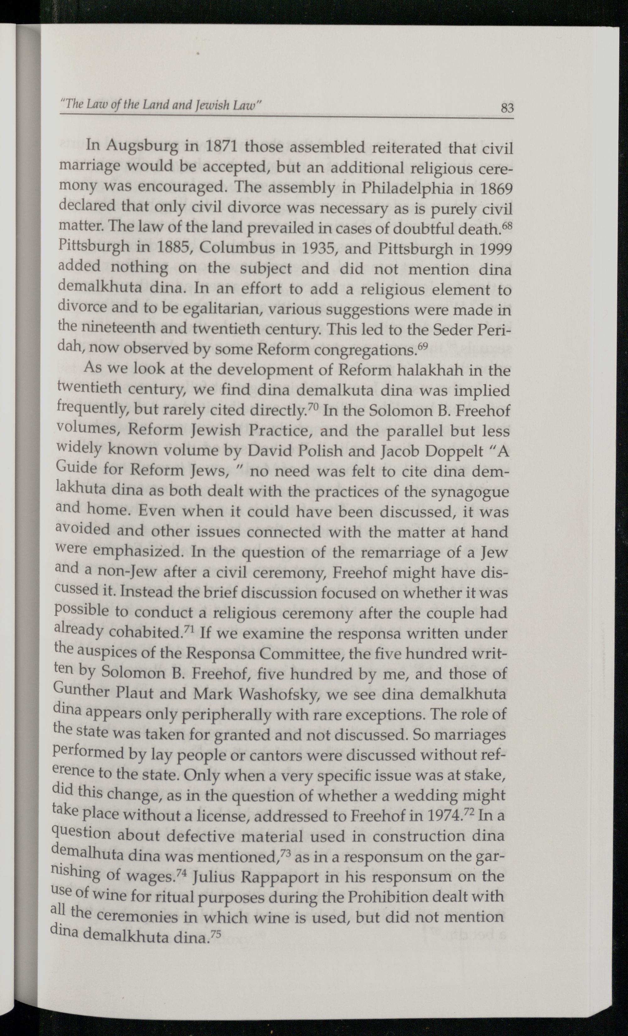 As we look at the development of Reform halakhah in the twentieth century, we find dina demalkuta dina was implied frequently, but rarely cited directly.” In the Solomon B. Freehof volumes, Reform Jewish Practice, and the parallel but less widely known volume by David Polish and Jacob Doppelt“A Guide for Reform Jews,” no need was felt to cite dina demlakhuta dina as both dealt with the practices of the synagogue and home. Even when it could have been discussed, it was avoided and other issues connected with the matter at hand were emphasized. In the question of the remarriage of a Jew and a non-Jew after a civil ceremony, Freehof might have discussed it. Instead the brief discussion focused on whether it was possible to conduct a religious ceremony after the couple had already cohabited.”! If we examine the responsa written under the auspices of the Responsa Committee, the five hundred written by Solomon B. Freehof , five hundred by me, and those of Gunther Plaut and Mark Washofsky, we see dina demalkhuta dina appears only peripherally with rare exceptions. The role of the state was taken for granted and not discussed. So marriages performed by lay people or cantors were discussed without reference to the state. Only when a very specific issue was at stake, did this change, as in the question of whether a wedding might take place without a license, addressed to Freehof in 1974.7 In a question about defective material used in construction dina demalhuta dina was mentioned,” as in a responsum on the garNishing of wages.” Julius Rappaport in his responsum on the use of wine for ritual purposes during the Prohibition dealt with all the ceremonies in which wine is used, but did not mention dina demalkhuta dina.”