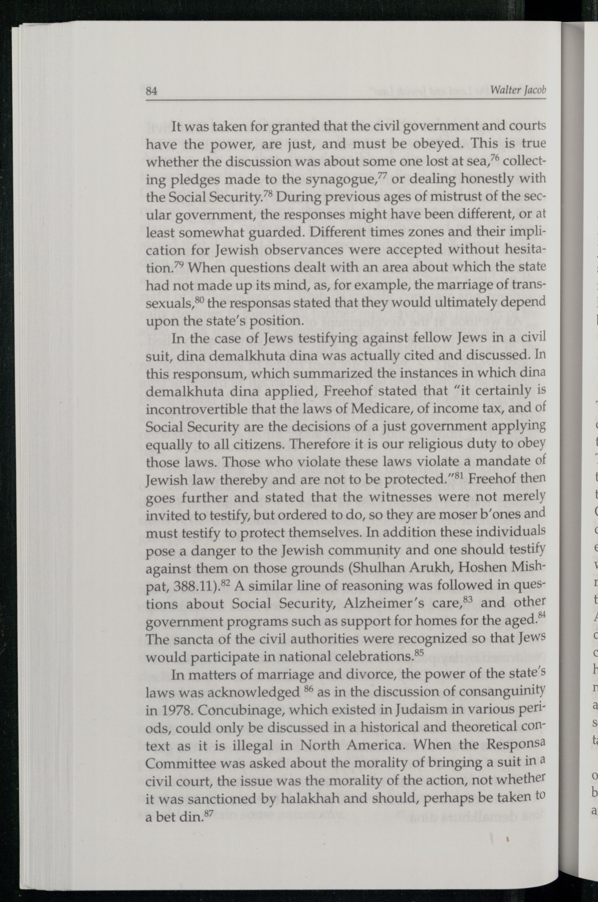 In matters of marriage and divorce, the power of the state's laws was acknowledged# as in the discussion of consanguinity in 1978. Concubinage, which existed in Judaism in various periods, could only be discussed in a historical and theoretical context as it is illegal in North America . When the Responsd Committee was asked about the morality of bringing a suit in civil court, the issue was the morality of the action, not whether it was sanctioned by halakhah and should, perhaps be taken a bet din.%”