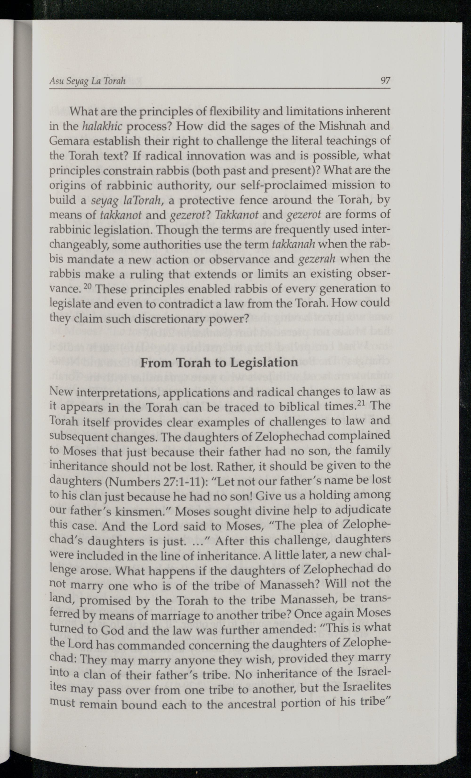 New interpretations, applications and radical changes to law as it appears in the Torah can be traced to biblical times.?! The Torah itself provides clear examples of challenges to law and subsequent changes. The daughters of Zelophechad complained to Moses that just because their father had no son, the family inheritance should not be lost. Rather, it should be given to the daughters(Numbers 27:1-11):“Let not our father’s name be lost to his clan just because he had no son! Give us a holding among our father’s kinsmen.” Moses sought divine help to adjudicate this case. And the Lord said to Moses ,“The plea of Zelophechad’s daughters is just....” After this challenge, daughters were included in the line of inheritance. A little later, a new challenge arose. What happens if the daughters of Zelophechad do Not marry one who is of the tribe of Manasseh ? Will not the land, promised by the Torah to the tribe Manasseh , be transferred by means of marriage to another tribe? Once again Moses turned to God and the law was further amended:“This is what the Lord has commanded concerning the daughters of Zelophechad: They may marry anyone they wish, provided they marry Into a clan of their father’s tribe. No inheritance of the I[sraeltes may pass over from one tribe to another, but the Israelites Must remain bound each to the ancestral portion ot his tribe”