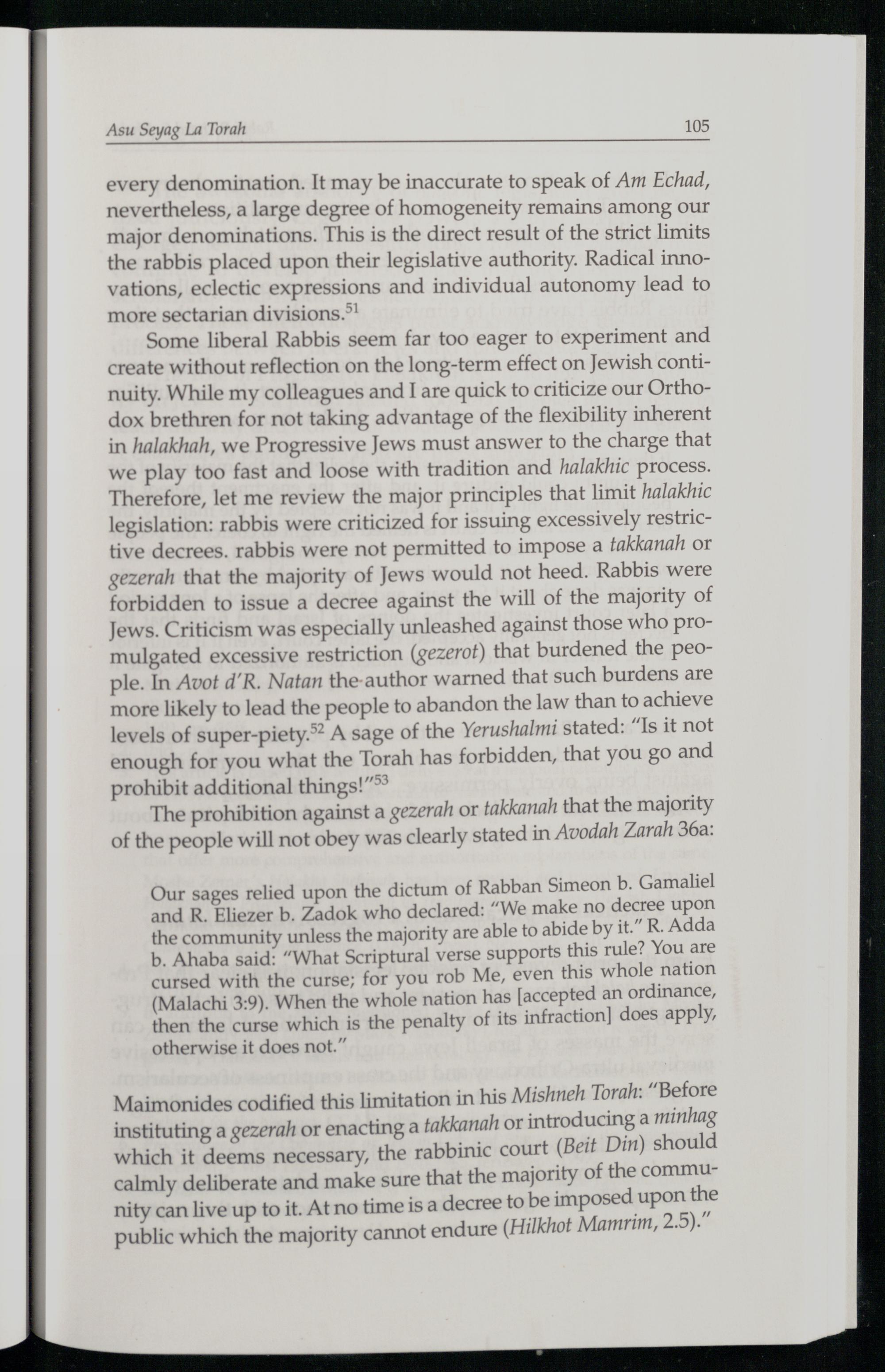 Some liberal Rabbis seem far too eager to experiment and create without reflection on the long-term effect on Jewish continuity. While my colleagues and I are quick to criticize our Ortho dox brethren for not taking advantage of the flexibility inherent in halakhah, we Progressive Jews must answer to the charge that we play too fast and loose with tradition and halakhic process. Therefore, let me review the major principles that limit halakhic legislation: rabbis were criticized for issuing excessively restrictive decrees. rabbis were not permitted to impose a takkanah or gezerah that the majority of Jews would not heed. Rabbis were forbidden to issue a decree against the will of the majority of Jews. Criticism was especially unleashed against those who promulgated excessive restriction(gezerot) that burdened the people. In Avot d'R. Natan the-author warned that such burdens are more likely to lead the people to abandon the Jaw than to achieve levels of super-piety.>? A sage of the Yerushalmi stated:“Is it not enough for you what the Torah has forbidden, that you go and prohibit additional things!”