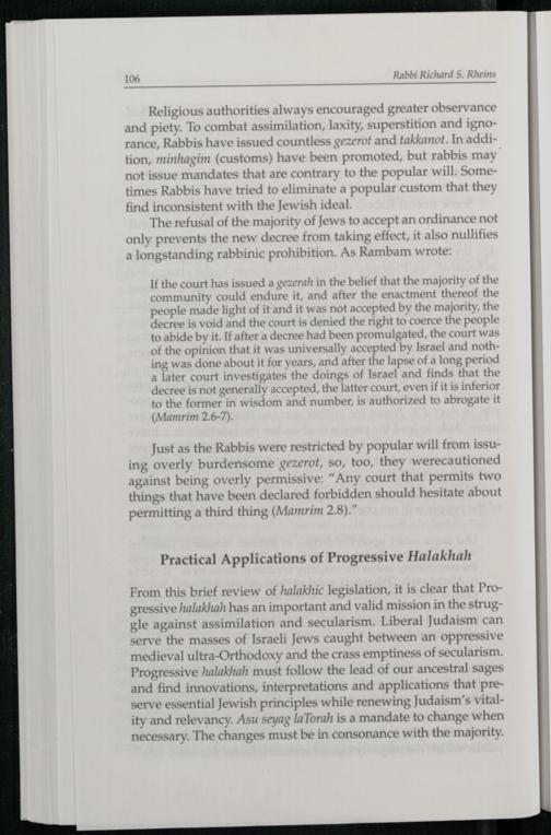 From this brief review of halakhic legislation, it is clear that Progressive halakhah has an important and valid mission in the struggle against assimilation and secularism. Liberal Judaism can serve the masses of Israeli Jews caught between an oppressive medieval ultra-Orthodoxy and the crass emptiness of secularism. Progressive halakhah must follow the lead of our ancestral sages and find innovations, interpretations and applications that preserve essential Jewish principles while renewing Judaism 's vitality and relevancy. Asu seyag laTorah is a mandate to change when necessary. The changes must be in consonance with the majority.