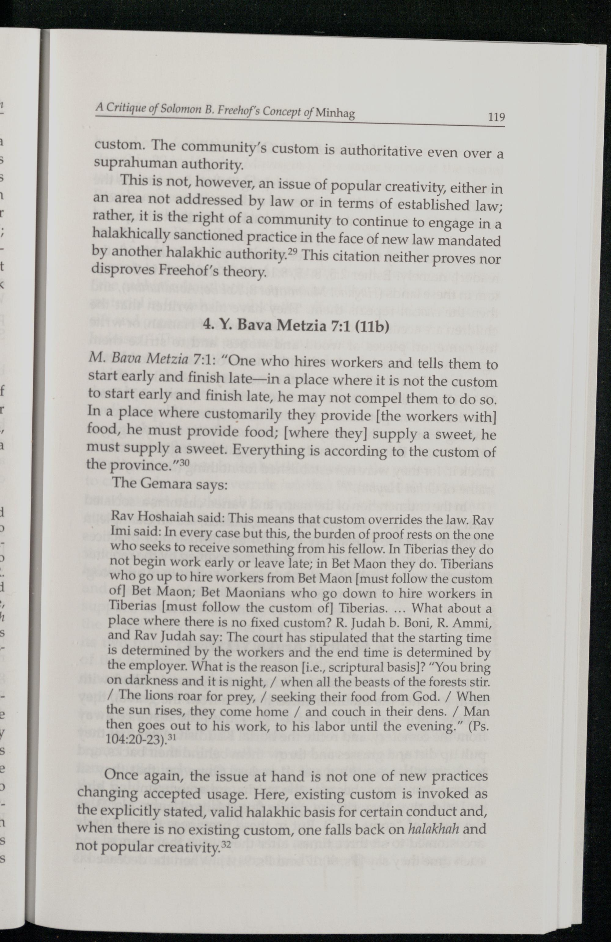 Rav Hoshaiah said: This means that custom overrides the law. Rav Imi said: In every case but this, the burden of proof rests on the one who seeks to receive something from his fellow. In Tiberias they do not begin work early or leave late; in Bet Maon they do. Tiberians who go up to hire workers from Bet Maon[must follow the custom of] Bet Maon; Bet Maonians who go down to hire workers in Tiberias[must follow the custom of] Tiberias.... What about a place where there is no fixed custom? R. Judah b. Boni, R. Ammi, and Rav Judah say: The court has stipulated that the starting time is determined by the workers and the end time is determined by the employer. What is the reason[i.e., scriptural basis]?“You bring on darkness and it is night,/ when all the beasts of the forests stir. / The lions roar for prey,/ seeking their food from God. / When the sun rises, they come home/ and couch in their dens./ Man then goes out to his work, to his labor until the evening.”(Ps. 104:20-23).31