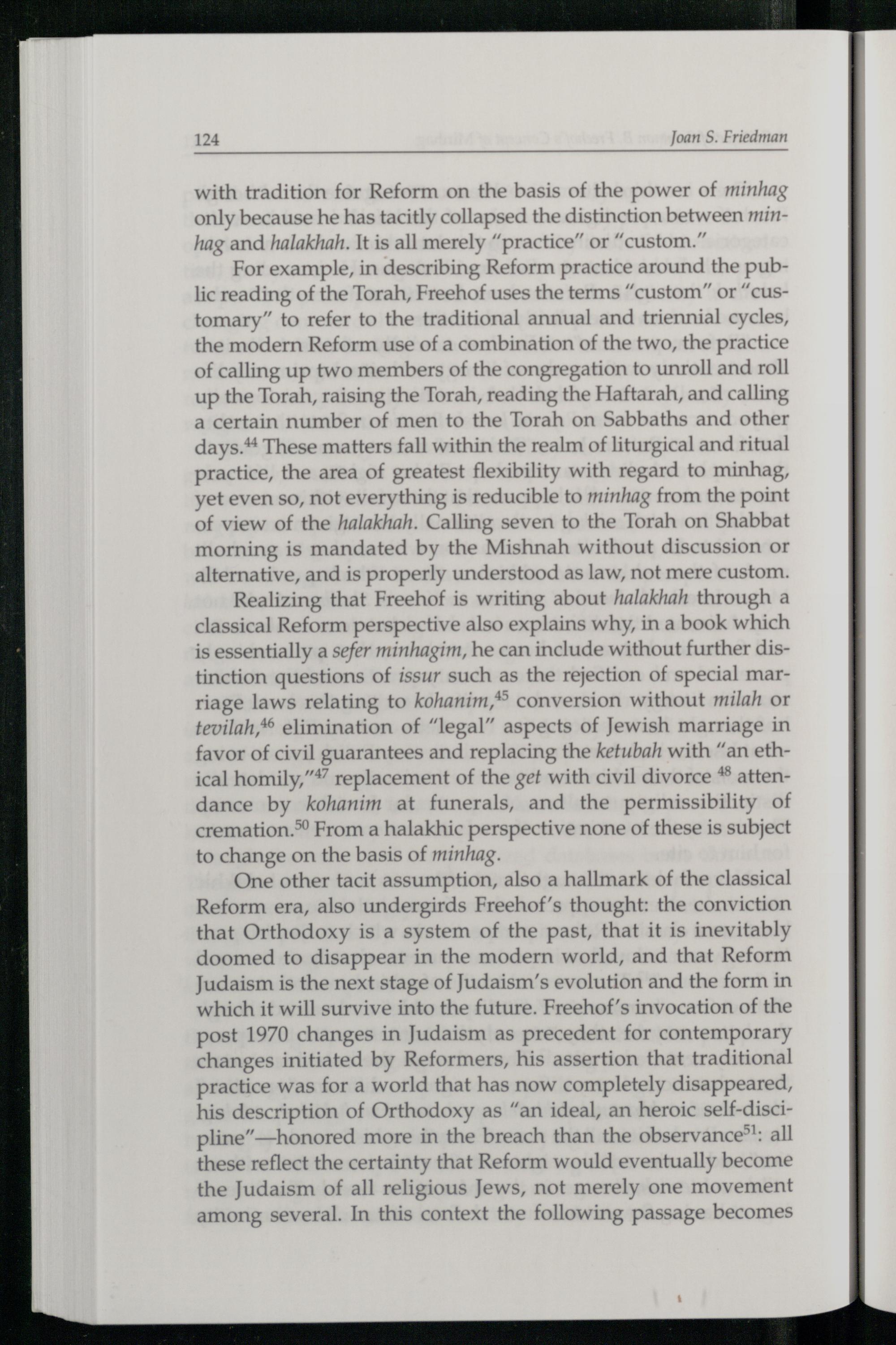 Realizing that Freehof is writing about halakhah through a classical Reform perspective also explains why, in a book which is essentially a sefer minhagim, he can include without further distinction questions of issur such as the rejection of special marriage laws relating to kohanim,*> conversion without milah or tevilah,*® elimination of“legal” aspects of Jewish marriage in favor of civil guarantees and replacing the ketubah with“an ethical homily,”#” replacement of the get with civil divorce** attendance by kohanim at funerals, and the permissibility of cremation.” From a halakhic perspective none of these is subject to change on the basis of minhag.