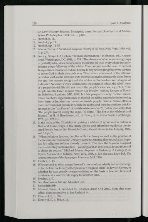 dic Babylonia, Lanham , MD , 1987, but his perspective only further undermines Freehof ’s argument, since in the end the rabbis succeeded in imposing their form of Judaism on the entire Jewish people. Shmuel Safrai offers a more conventional picture in which the rabbis and their institutions quickly emerge as the“backbone” of Jewish existence after 70, but he also states that “the people[were] led by the sages.” S. Safra,“1 he Era of the Mishnah and Talmud ” in H. H. Ben-Sasson , ed., A History of the Jewish People, Cambridge, 1976, pp. 309-311.